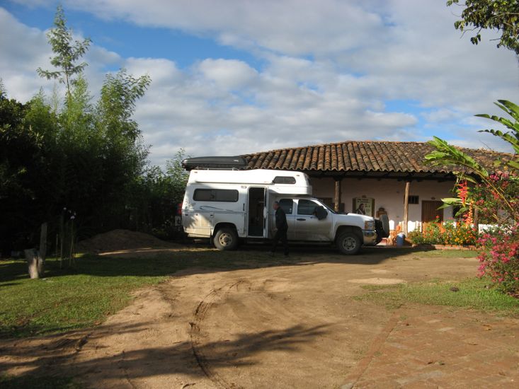 This morning we made an early start on retracing our steps along the slow road back to Paletara. The weather was better but the road was not. About 60 miles in all back to Paletara, the last 40 over dirt and the total trip took 5 1/2 hours. Lots of low range over big pot holes. There was more traffic on the road today almost all of it trucks carrying cattle or sacks of something. One truck driver stopped to warn us that there were guerillas on the road - at least that's what we think he said. But we had no problems.