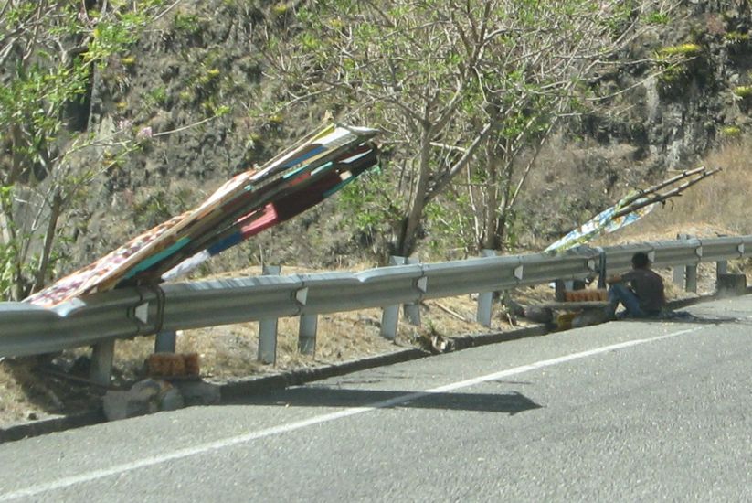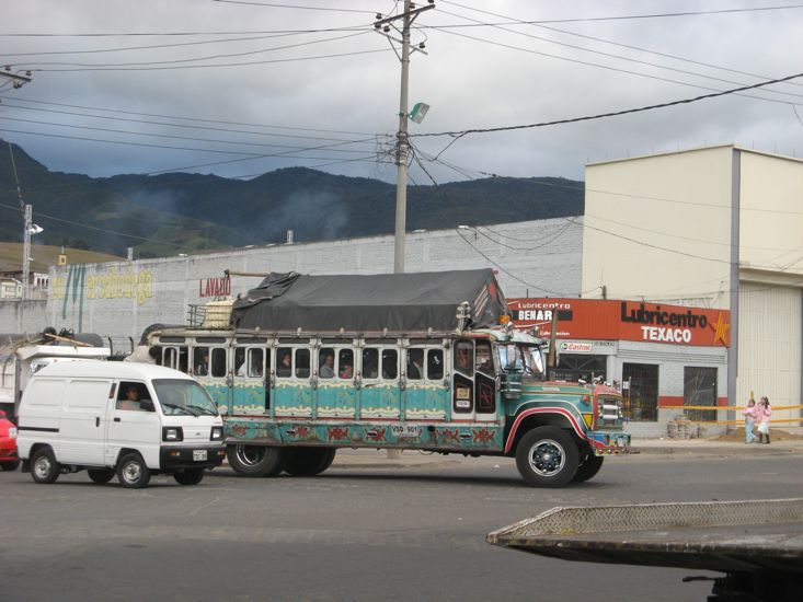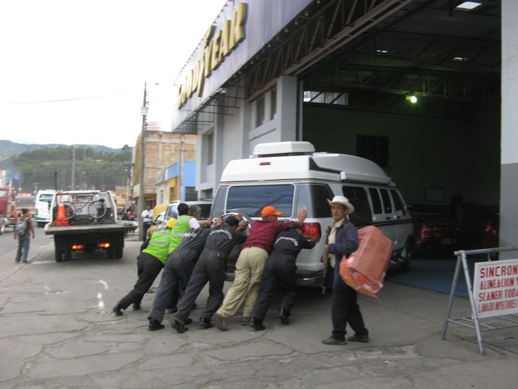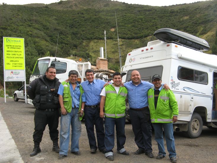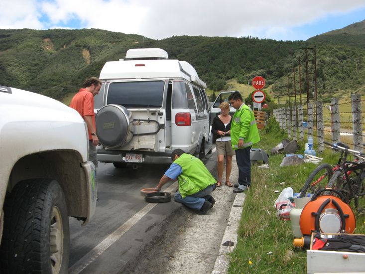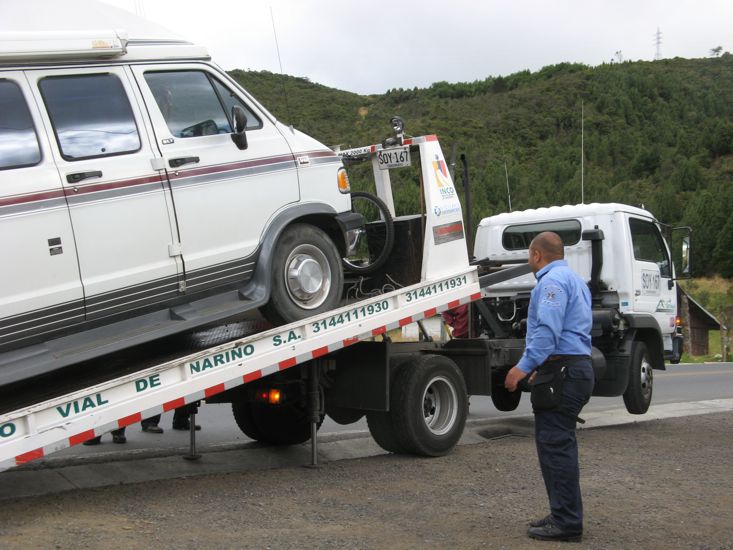 At 10:30 just a few miles north of Pasto as we pulled up to a toll booth Bernie's vehicle simply died, no engine. We pushed it back from the toll booth and started trying to diagnose the problem, but no good. Asking at the toll booth we discovered that the company that manages this section of road provides free roadside mechanical assistance so we called. Within 20 minutes two green coated mechanics arrived and took over the effort. About an hour later we were on our way, dirty fuel filter they said, continuing the climb into Pasto. BUT - two miles further on a steep grade it died again. Nina and I drove back to collect the mechanics before they went onto their next job and pretty soon we had four vehicles parked on a narrow steep section of the highway. We used the Tiger and a very suspect length of steel cable to tow the sick vehicle to a parking area a few hundred yards up the highway; this turned out to be the local depot for the mechanics; and settled in for an afternoon of vehicle diagnosis.