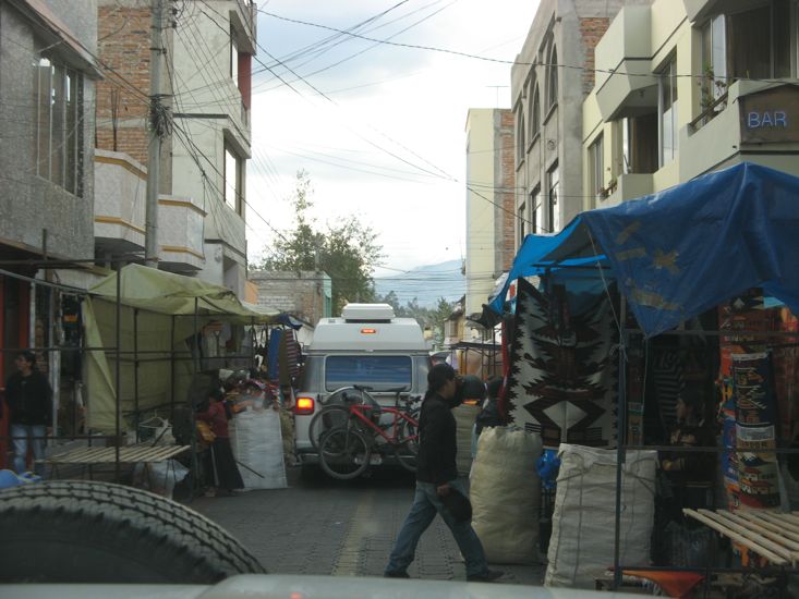 We arrived in Otavalo, our destination for the night, about 4:30 and hoped that some of its famous Saturday market was still in operation. We we got right in amongst the market, as Bernie who was leading at this time, turned into one of the market streets in the heart of Otavalo. We spent 20 minutes negotiating our way between the stalls and at one point I clipped the canopy cover on one stall knocking the vendors merchandise onto the roadway. Fortunately nothing was broken and a small payment seemed to mend the social gaff.