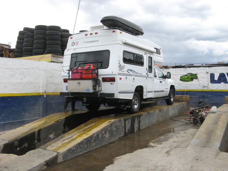 Not much to report about today. It took some careful driving to descend from our ridge top camping spot and thereafter a slow drive down the cobbled road back into Otavalo and then another trip to the super market and hardware store in Ibarra. On the way out of Ibarra we found a Lavadero to wash away the Mojanda dust and San Agustin mud that was now covering the Tiger. We sat for almost two hours while a team of three worked to get the vehicle back to something like clean condition.