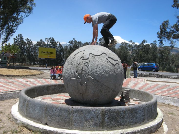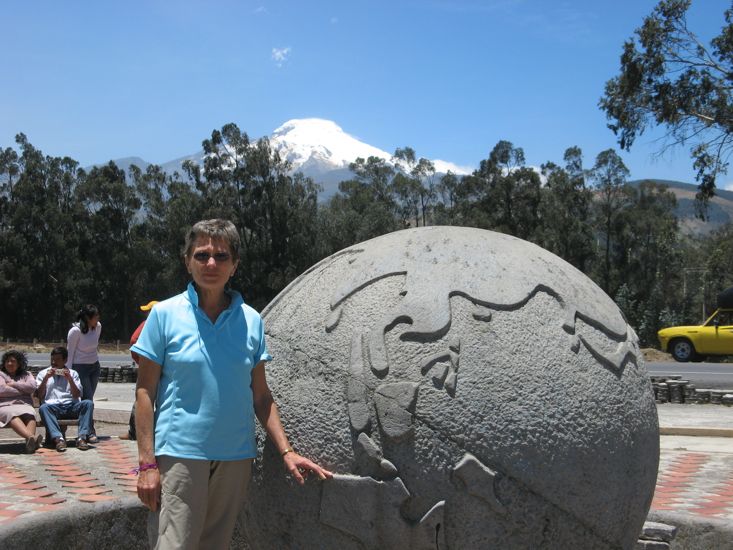 The country side south from Otavalo continued dry and dusty with deep wide valleys and an abundance of eucalyptus trees. At about km post 43 we came to the Equator monument and took the obligatory photographs. The temperature was 70°F, there was a snow capped mountain in the background, and we were at 10,000 ft. Not what I used to think of when I heard the word "equator".