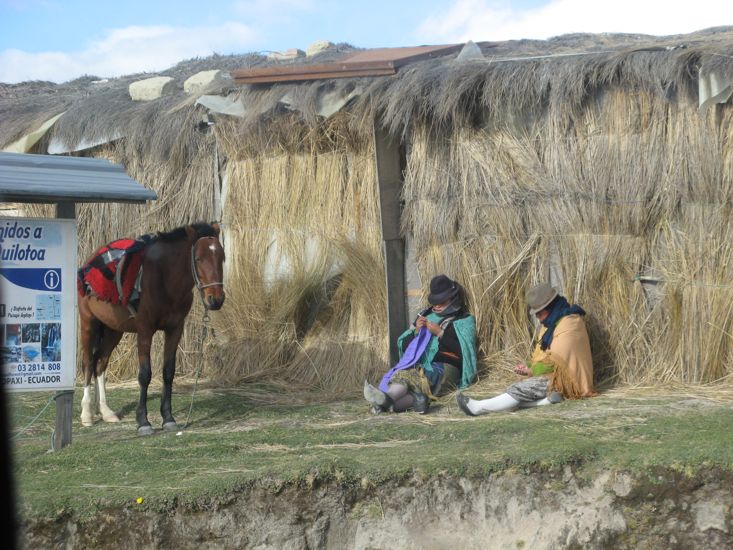 From Saquisili we headed back to the PanAmericana and onto Latacunga looking for the turn off to Pujili our entry point to the Quilotoa Loop. Well it took a couple of tries but we found the turn and started the road to Zumbahua, where we would turn north to the lake. To say this drive was stunning would be a vast understatement. Immediately out of Latacunga the road climbed from 9000' to 13000' all the while affording great views of Latacunga below in the valley and Volcan Cotapaxi (the second highest mountain in Ecuador and a perfectly cone shaped volcano) to the north east, though with cloud shrouding most of the snow capped summit. From the top of the climb the road meandered across the plateau west for many kilometers amongst cultivated fields, herds of sheep with their traditionally dressed Indian shepherds. Along the way the road made two spectacular descents, the first into the valley of and across the Tigua River, then back up to 13,000' before descending again into the village of Zumbahau. From the village a poor quality sealed road traveled 14kms to the parking lot of Laguna Quilotoa at 12,745'. It is a forlorn place, even in the afternoon sunshine it was cold and windy - though later we would get a taste of the strongest winds we have felt on the trip.