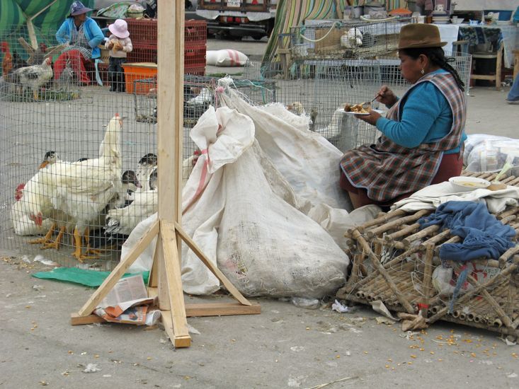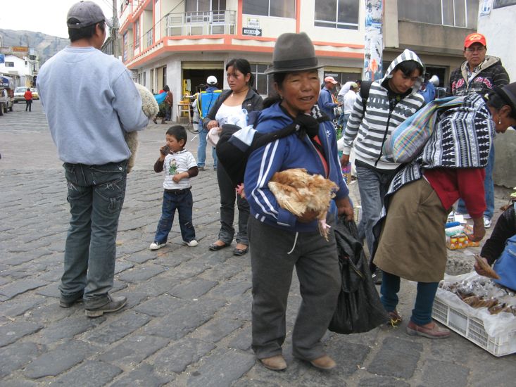 The next challenge was to find the turn off to the town of Saquisili, renowned for its Thursday market and also part of the Quilotoa Loop. Again without good maps we had to rely on a degree of guess work, detective work, and the old strategy of follow the buses or pickup trucks full of people because on a market day everything is either going to or from the market. This worked and about 11:00 am we arrived in Saquisili. It would not be accurate to say the town had a market, but rather the town was a market. We visited as least three large squares that were full of vendors and many of the connecting streets were also crowded with vendors of one sort or another selling their wares. Moreover this was definitely not a tourist market, one could tell that at a glance by the merchandize. Tourists rarely want to buy second hand shoes, used car parts or tools, new beds and mattresses, 2 ft diameter bowls made out of used truck tires, or live guinea pigs for the nights dinner.