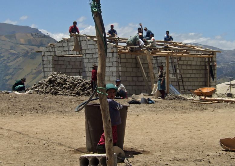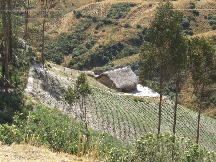 Today we continued the Quilotoa Loop traveling from the lake north to Chugchilan, then Sigchos and on towards Taocaso - which we did not make. The road was dirt until Sigchos (fine grained sand or volcanic ash) and narrow, at times the wash-aways on the downhill side made it just wide enough for us to pass with only a foot or so spare on each side. For over 15 miles and 2 hours it wound its way in and out of valleys following the contours of the land, affording wonderful views of the valleys, the cultivated fields, and closer to hand the dwellings of the local inhabitants. Like yesterday much of this journey was at elevations between 11,000' and 13,000', the land is generally treeless, and widely cultivated - and cultivated by hand. The fields are too steep for tractors even if the farmers could afford them.
