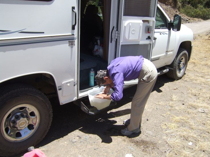 Last night was windy, did I say it was windy last night. Not a constant steady wind but terrific gusts that shook the Tiger. At times I feared that a window might give way or the Thule luggage container on the roof would rip off and get carried away. The wind we felt in Atigun Pass on the way to Deadhorse, AK was stronger but we did not camp with that wind. This morning was cold, for the first time since leaving Canada we turned on the house heater. Outside temp was about 40°F but with the wind - at least 30 mph it felt much colder. Even the locals were rugged up.