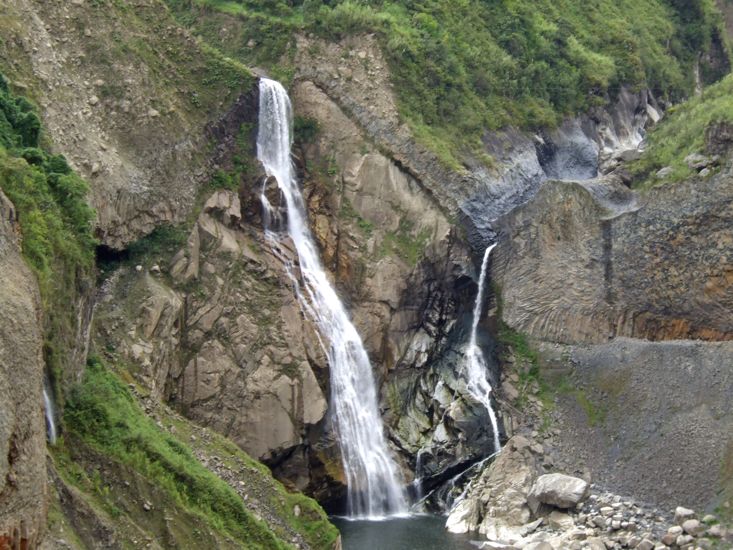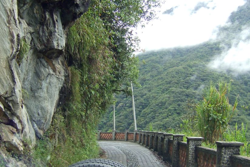 Today we planned a return visit to the resort town of Banos, but this time approaching it along the Pastaza river valley from the East. It made for a leisurely day of driving as the round trip only racked up 75 miles. Starting in humid tropical conditions at 3000 ft in Puyo the road winds its way along the Northern wall of the Pastaza valley above the cliffs of the lower gorge and eventually climbs out of the tropical vegetation as it nears Banos at just under 6000 ft. It is an impressive road, a number of dripping tunnels and lots of tight turns. Also a number of places where it is taking a lot of hard work to keep the road from being swept from the mountain side by slides and rock falls. There are a number of narrow side roads that enable tourists with smaller vehicles than ours to visit local villages, water falls and other attractions. There were quite a few tourists, both young and old, riding bikes along the 12 km section of the road into Banos.