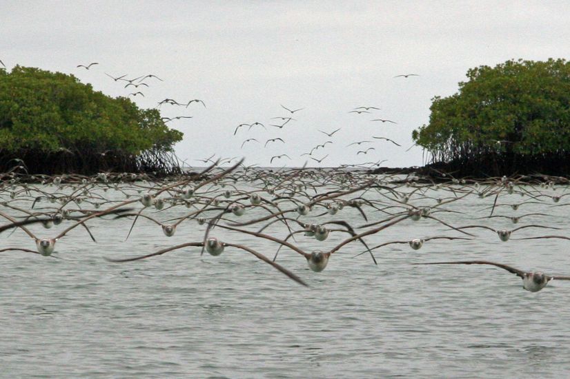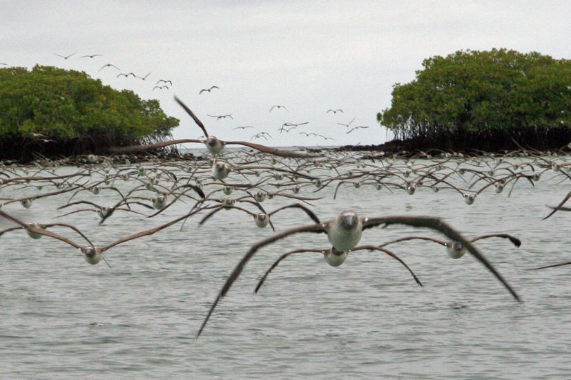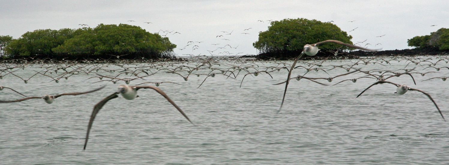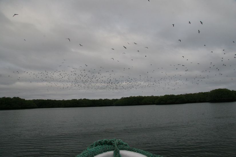 We were out in the dingy this morning by 6:00 am to ensure that even the last few hours of our visit got in some animal watching. And we were not disappointed. We cruised around a mangrove cove for an hour and saw a number of sea turtles, some small sharks, an eagle ray, and the most amazing sight of all - a flock of perhaps a thousand Blue Footed Boobies hunting and feeding in a pack. The flock would circle over the cove until a school of fish was spotted and then the entire flock would dive to feed. Just an amazing sight. After hitting the water the flock would surface and take to the air again - on some occasions almost running over us in our small dingy.