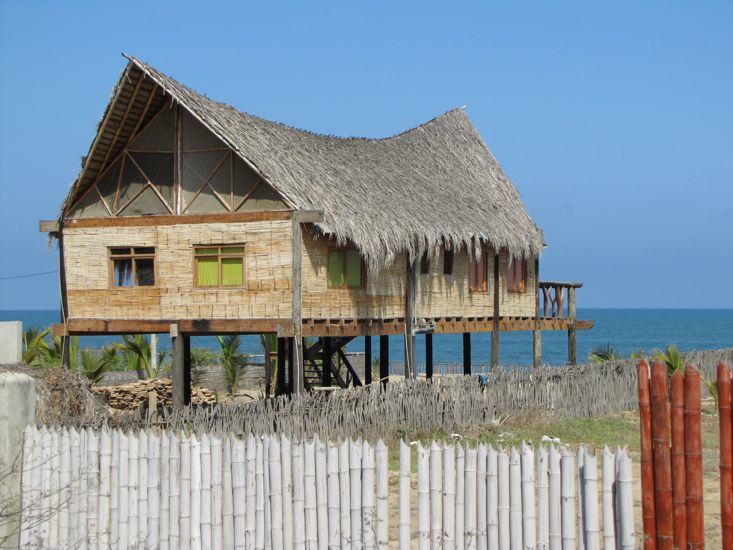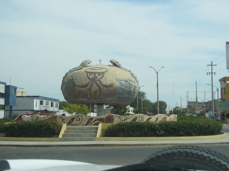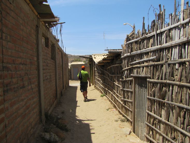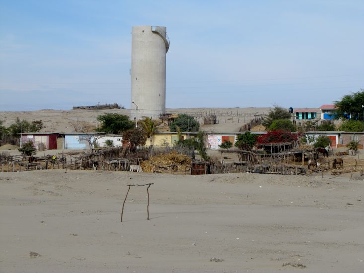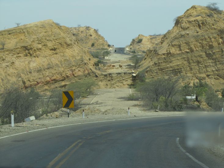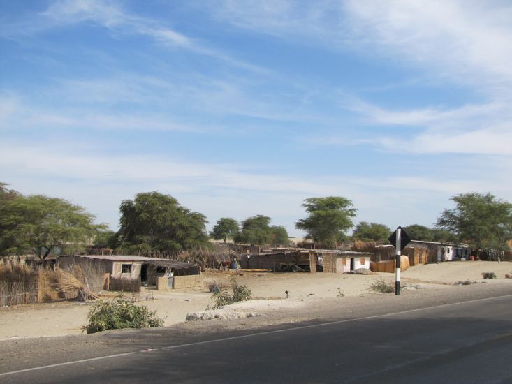 For much of the morning we drove along the dry coast of northern Peru with ocean on the right and dry, brown, barren, crumbling hills on the left. The road regularly passed through small ocean side towns/villages which looked poor, in most cases the highway was the only paved street in the town and often the other streets were not even graded, just simple paths between buildings. The buildings were a mix of adobe bricks, mud and stick walls, and woven bamboo. In many cases even the roofs were adobe?. Many towns had a river bed running across the highway to the sea, but things were so dry that the riverbeds were being used as roads, and looked like that had been the case for many years. However, many of the towns also had very large drains/culverts beside the road which suggested that some times they get a lot of rain. Later in the day we saw highway bridges that had been washed away during the last El Nino confirming that every so often there is very heavy rain.