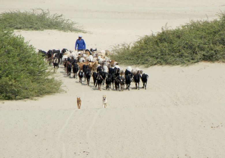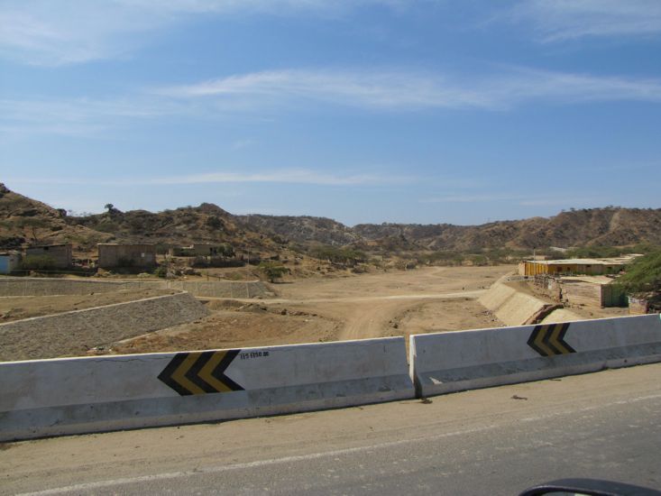 The road then headed away from the coast towards Sullana and eventually Piura. Our first taste of the inland was a strange mix of incredibly dry land interspersed with large areas of irrigated corn fields and rice paddies. In Piura we tried to find a hostel mentioned in our guide book but the road system and lack of street signs defeated us; thus we continued on from Piura into the Desierto De Sechura for about an hour before stopping for the night. This first phase of the desert had regular settlements of very poor looking dwellings, very dry looking low shrubs and a sprinkling of greener shade trees. We were wondering how the people that lived here made a living; but a few herds of goats gave us (we think) part of the answer to that question. We still don't know how they get water.
