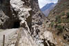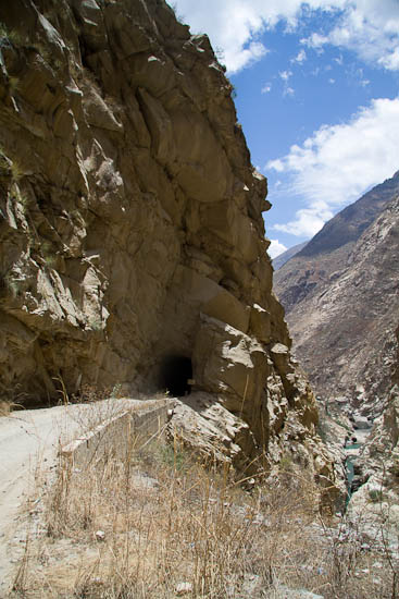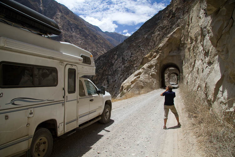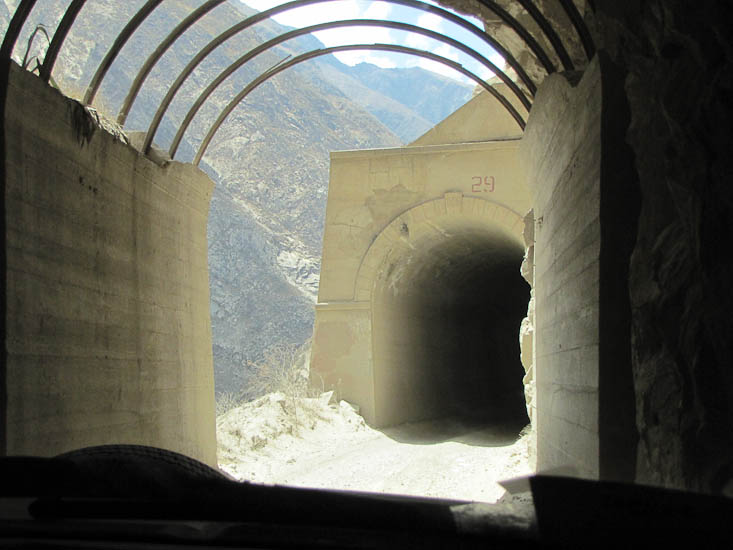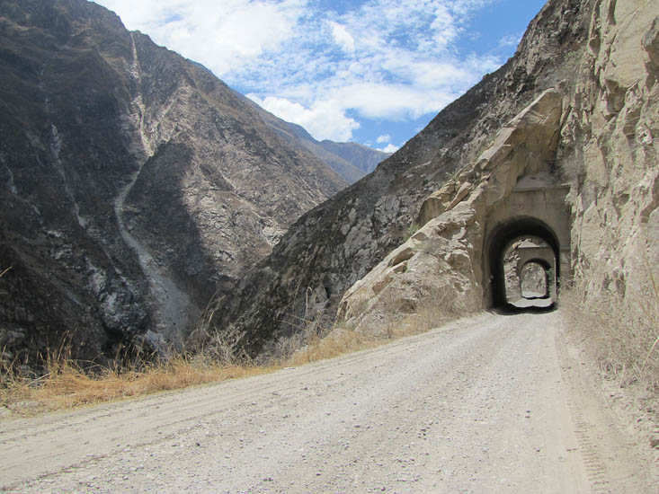 We continued on the rough dirt road this morning to the village of Huallanca looking forward to the sealed road south to Caraz as described in the guide book. But alas the book lied, at least a little. After Caraz the road continued to be gravel but of a better quality as it climbed up into the Canon Del Pato. This was yet another amazing road. Built about 1913, presumably to put in the hydro power plant, it winds along the side of the canyon for maybe 6 miles and passes through 30 rough rock tunnels. At places the canyon (like the one yesterday) is less than 50 yards wide (about a 1/2 wedge shot).