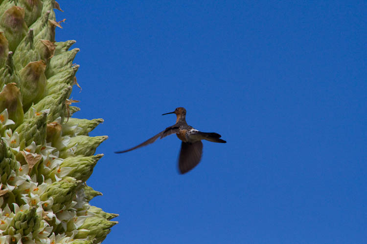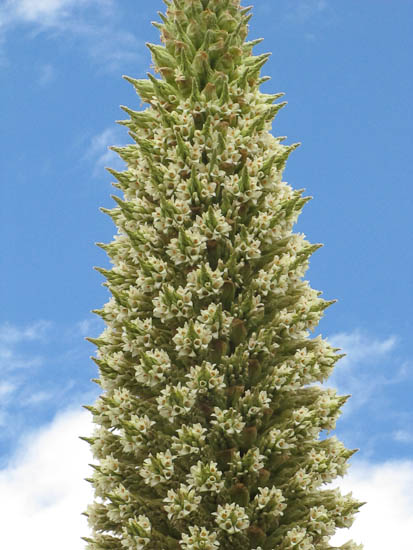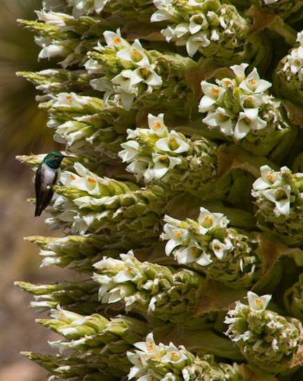 It's a rare plant from the bromeliads, or pineapple family, that is only found in parts of Peru and Bolivia. It starts out as a large bunch of long spiny leaves that reach up to 2m in diameter. It takes about 100 years to get to full size and then it flowers by producing a huge vertical spike up to 10m high which is covered by as many as 20,000 flowers. It flowers for about three months and then dies. These plants are pollinated by humming birds.