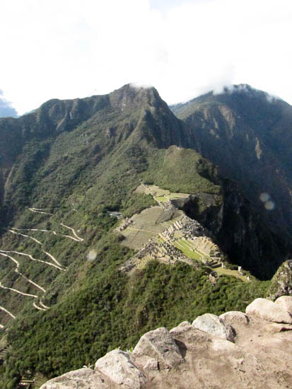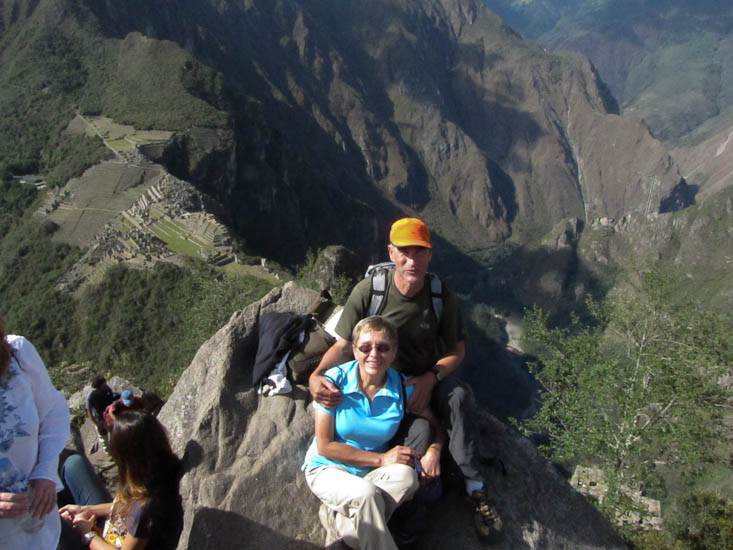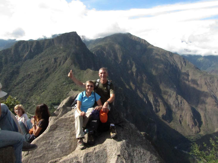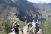 There is no way I can make words do justice to the climb up and down this mountain to the ruins at the top. The route is a path, with stone flagging and stone steps and stair ways, so it is not rough - but it is steep. Very steep, and the steepness is much more apparent on the way down when you have to look down the path to the valley floor maybe 3-4000 ft below. That's what climbers call exposure. The view of the main site and the surrounding mountains from the top was wonderful, we spent a long time on top admiring the view. As we struggled down the steep stairways we wondered how anyone could build these structures - we had trouble simply walking on them.