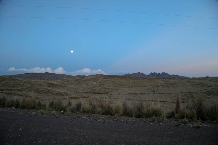 We eventually stopped for the night in an un-used loop of highway. About 5:30 while cooking dinner a couple of Carretera Police in their standard Toyota Landcruiser dropped in to see what we were doing but said it was OK for us to stay there the night. We had a nice view from our camp, and the rising full moon was gorgeous.