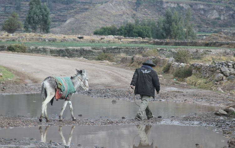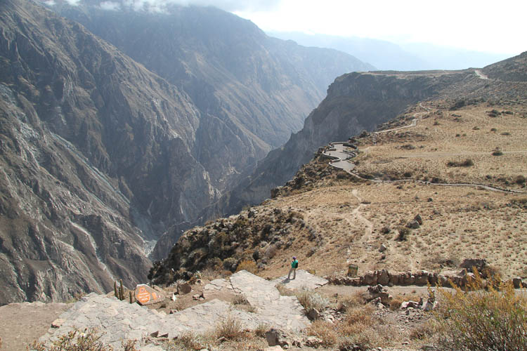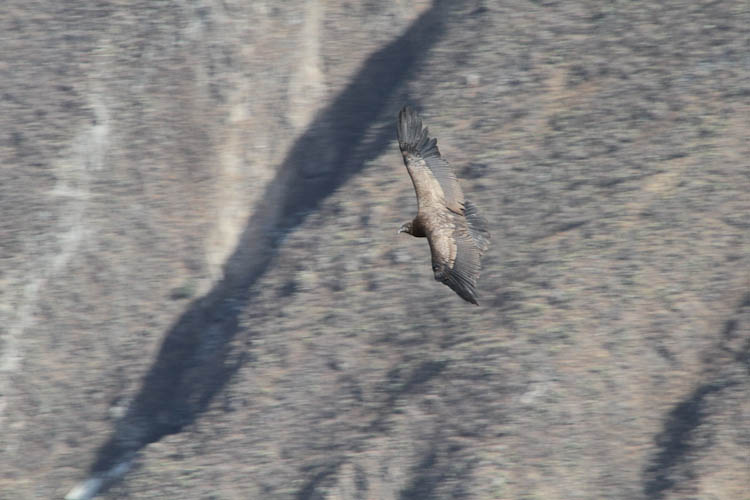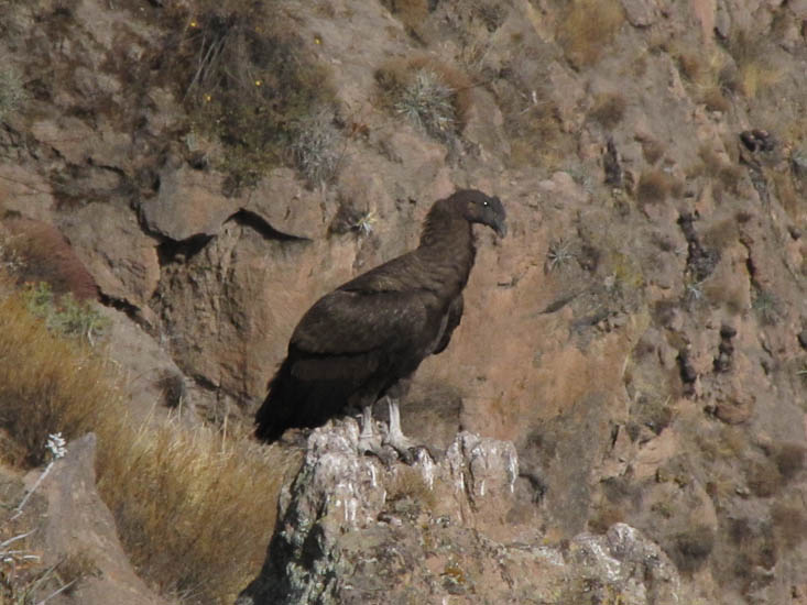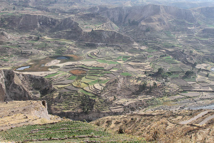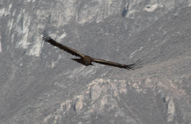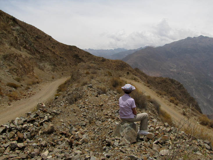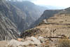 We were on the road to Cruz del Condor by about 7:00 am as the condors, apparently, are only visible around 8:00 am and 4:30 pm, and we wanted to be there in time to see them this morning. Apparently so did every other tourist and tourist operator for 200 miles around as the road was busy. It was also rough with the traffic from tourist buses making heavy washboards in addition to the parts of the road that are simply creek beds. But to compensate for the roughness the drive was wonderful. It winds along the side of a very deep steep valley both sides of which are covered with terraced agricultural land, foot trails, and villages (with no road access). The scale of the terracing is hard to comprehend, particularly when one realizes that much of it has been done by hand over hundreds of years of farming.