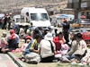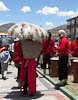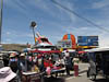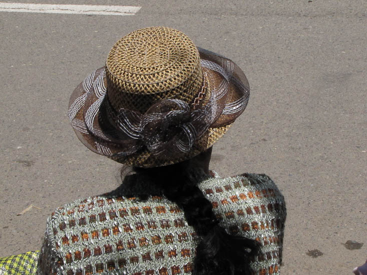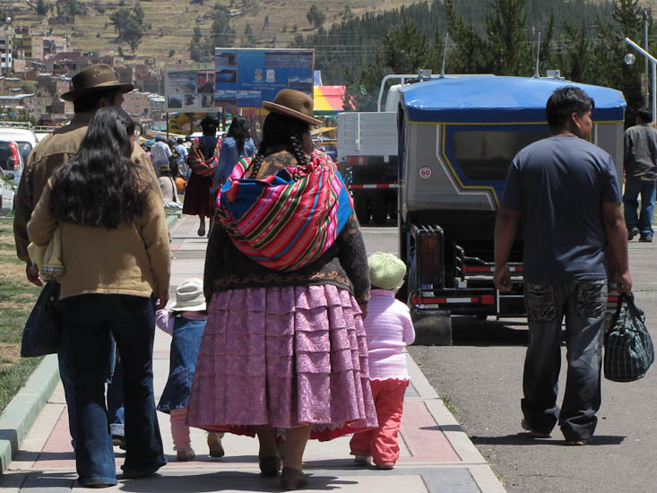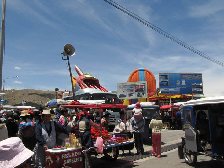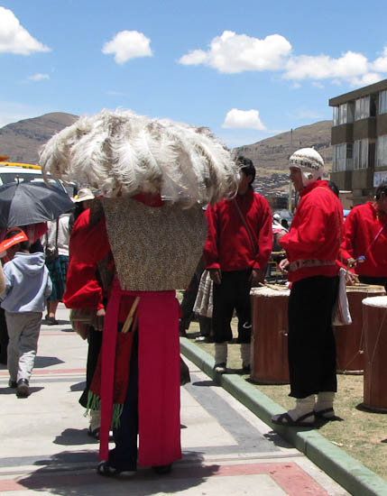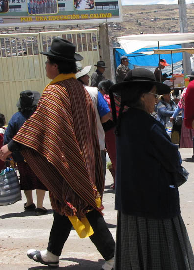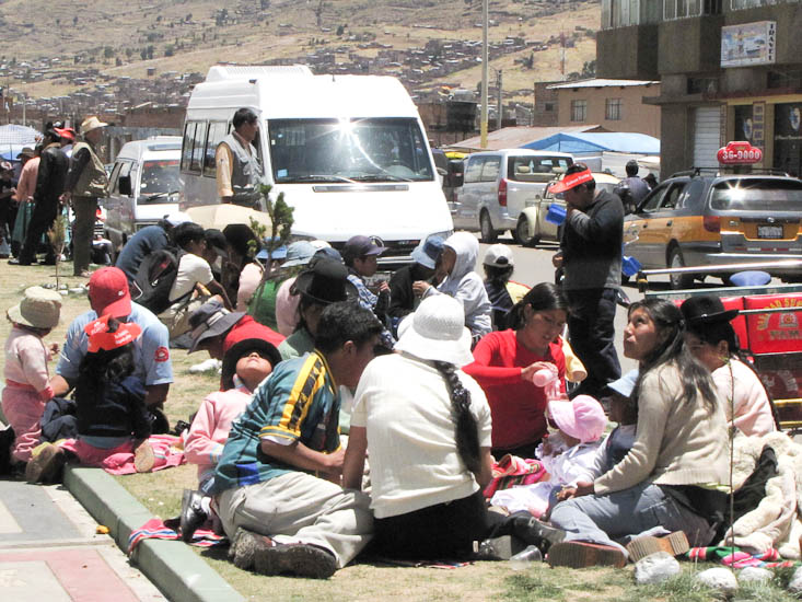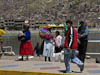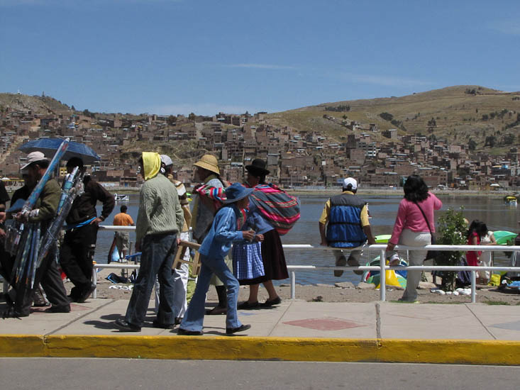 The approach to Puno descends from a hill giving a fine view of another relatively un-attractive town that like Cusco seems to be composed entirely of red mud brick buildings. We wound our way towards to dock area in order to see the famous Lake Titicaca only to discover a huge crowd of market stalls and pedestrians strolling around that we had to navigate between and around. It turned out we had arrived just in time for some form of parade; that's why the crowd was there. It made for a very interesting couple of hours just watching the antics of the almost entirely local crowd, the parade members, and the various vendors and vehicles.