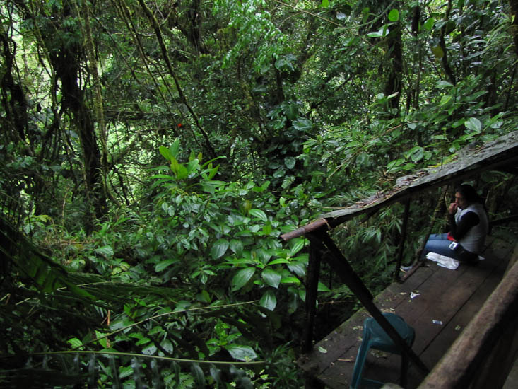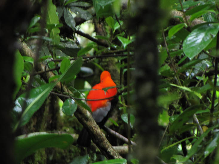 We were awake at 4:30 am this morning to go to see a bird called Cock of the Rock. Each morning and afternoon these birds gather in a section of the forest near our lodge for about an hour, then disperse for the day, until their afternoon gathering. We spent an hour at this place looking with great diligence for a glimpse of the bright red male birds.