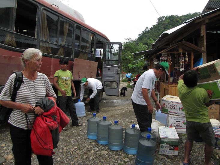 Following a quick breakfast we were back into the buses and another 3 hours descending further into the jungle lowlands. Yesterdays pattern continued; the further we went the wetter everything got and the worse the road got. Finally we reached Atalaya which for us was the end of the road and the start of boat leg of our journey. Just before Atalaya we noted that we were now down out of the mountains. We had a short wait in Atalaya for the previous tour group to return with the boat; we swapped with them. They got the bus to return to Cusco and we got the boat. In addition to us and our luggage the boat had to be loaded with all the food and other items we would need for the coming 7 days.