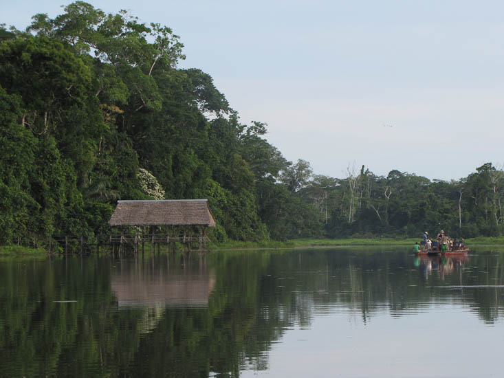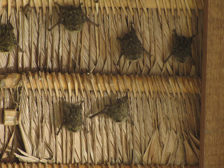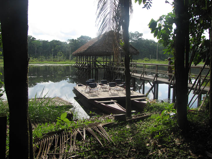 From Boca Manu we went another 2 hours down the Madre De Dios to our next lodge. The lodge is called Tambo Blanquillo. It's bigger than the other lodges we have been at, and had other guests in addition to us. The guest quarters are interesting. A Very large single roof covering a large space. Under this space a series of sleeping rooms and bathrooms have been built with walls that are only partitions. This is the only place we have been where the rooms are not screened in to protect from insects. However, thankfully, the beds have mosquito nets. All the huts we stayed in had mosquito nets,