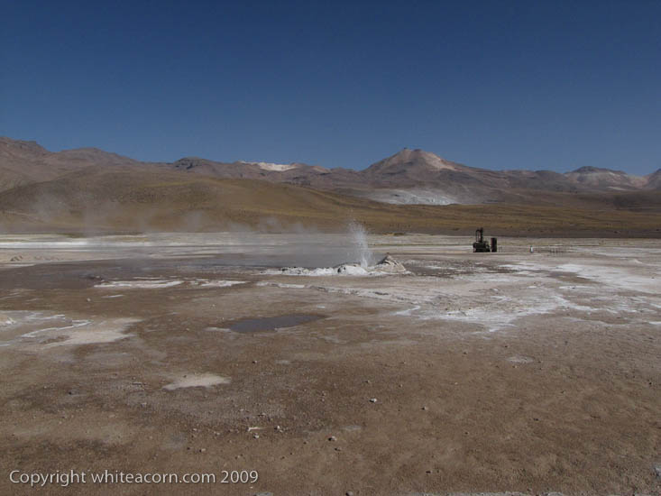 The drive inland continued with desert scenery, just unbelievably dry, and the road was deceptive in gaining altitude. Before we knew it we were at 10,000 ft. It took most of the day, interspersed with lunch and siesta breaks to reach the entrance to the geysers. The last 10 kms was undoubtedly the worst road we have so far encountered on the trip - deep and unavoidable washboards that made us wonder how the Tiger managed to hold together.