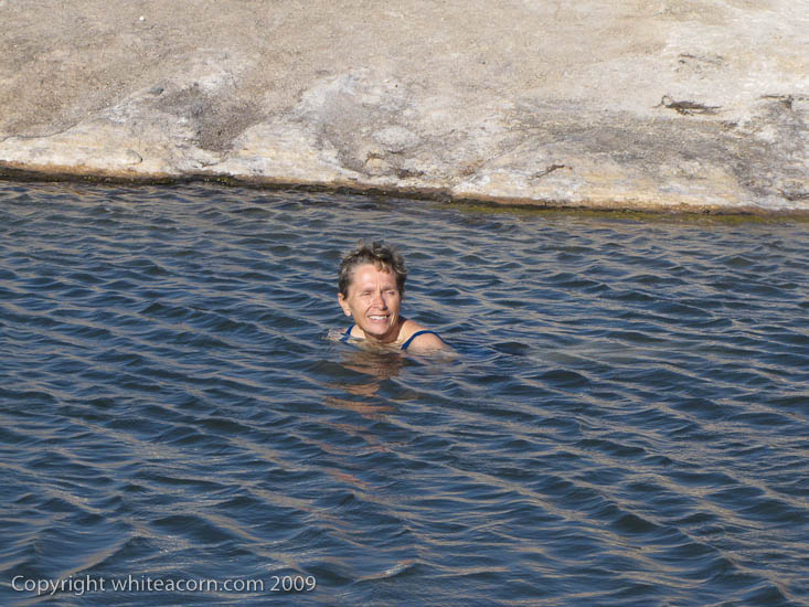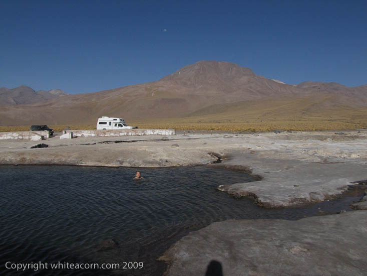 The geyser field was not very impressive in the afternoon, a few wisps of steam, some white and yellow coloring on the ground, not much else. It was a little more impressive up close when we drove into and around the various geysers and hot pools. In typical South American fashion there were no access restrictions. A road of sorts wandered all around the thermal area, we could walk whereever we wanted (subject to warnings about not falling into hot water - literally), and at one place there was a pool for swimming that had currents of very hot water running randomly through it.