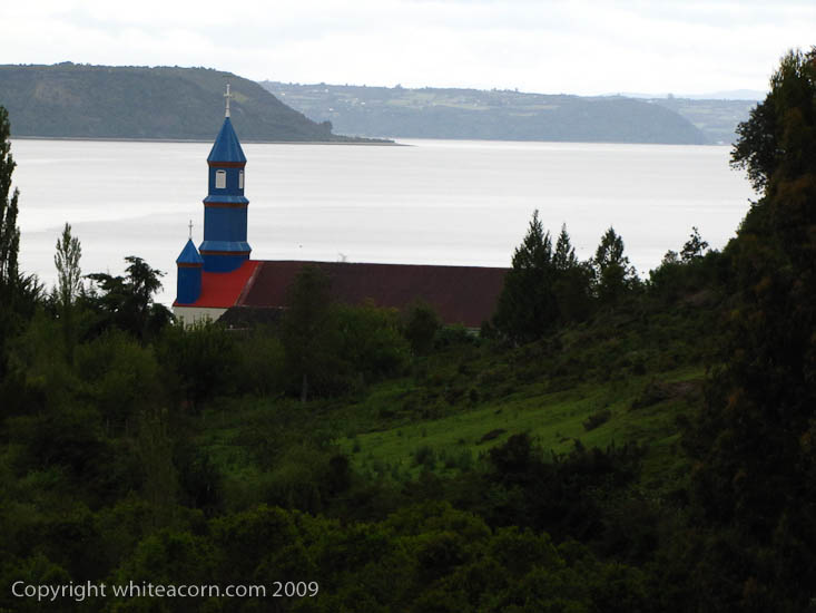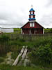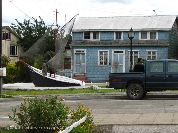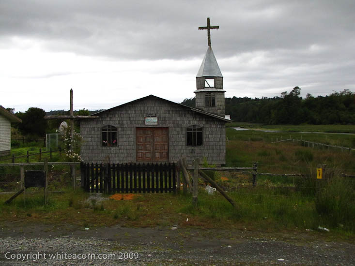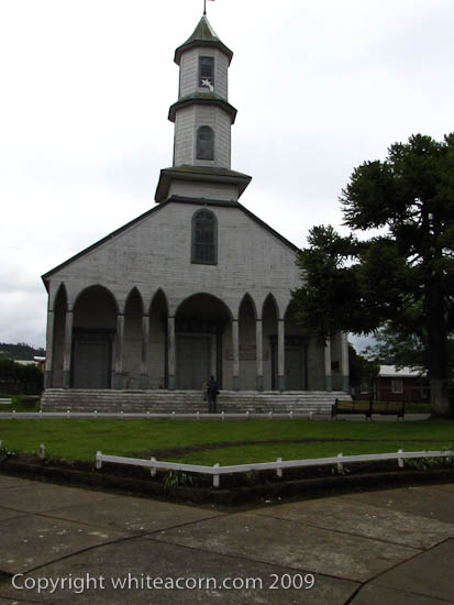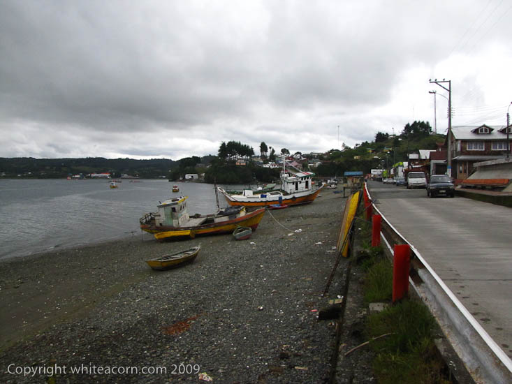 A little further down the highway we took another side trip to Quemchi and then to Tenaun. This turned out to be a tour of wooden German style churches for which the Island of Chiloe is apparently famous, a number are world heritage listed. Quemchi is a little fishing village. When we got there the tide was out so the foreshore was occupied by an assortment of beached fishing vessels. The buildings were small, quaint, often shingled, and showing a European style that reminded us of a down market version of Poulsbo (a little fishing town near Gig Harbor for the Aussies). I must be getting home sick for the grey sky and sea smells of Gig Harbor as I really liked this little village.