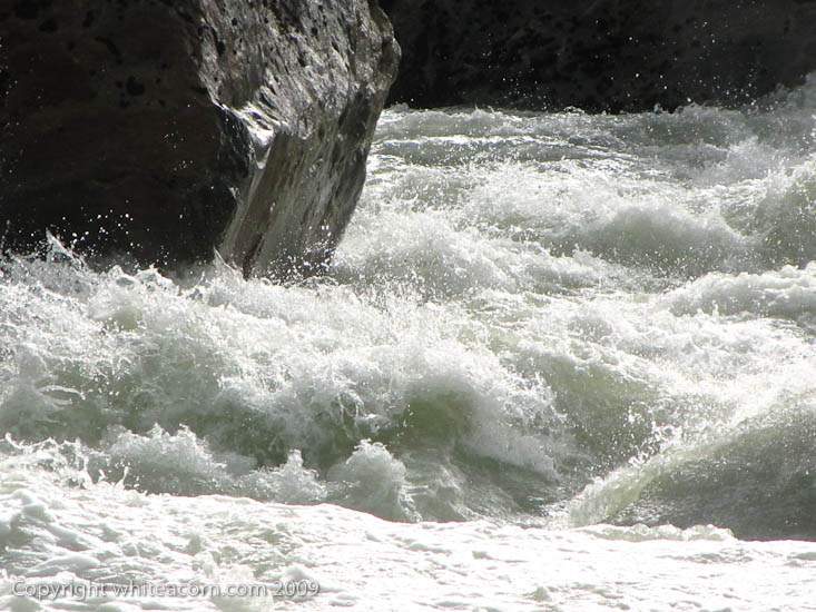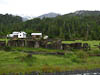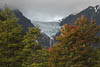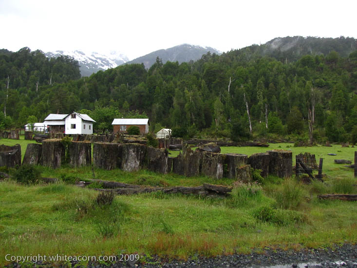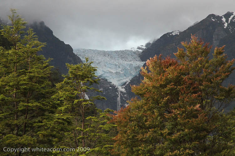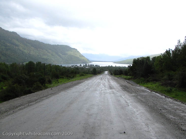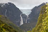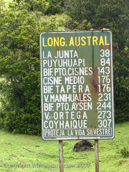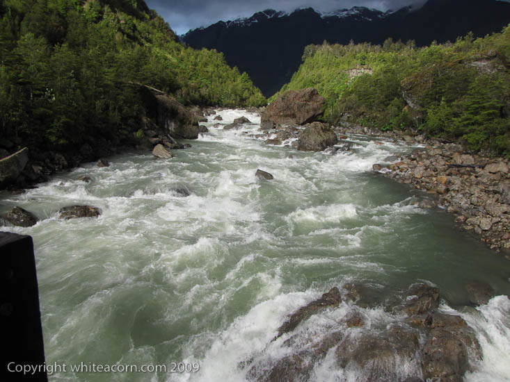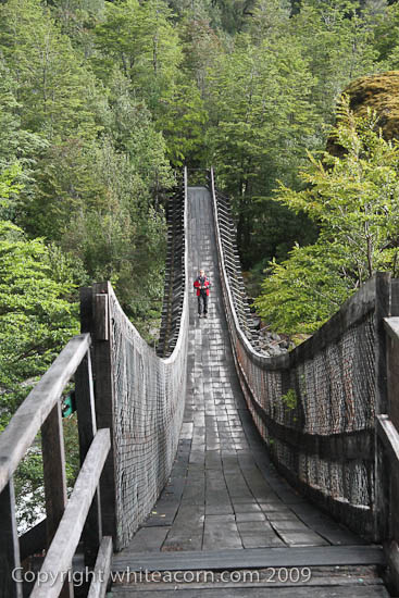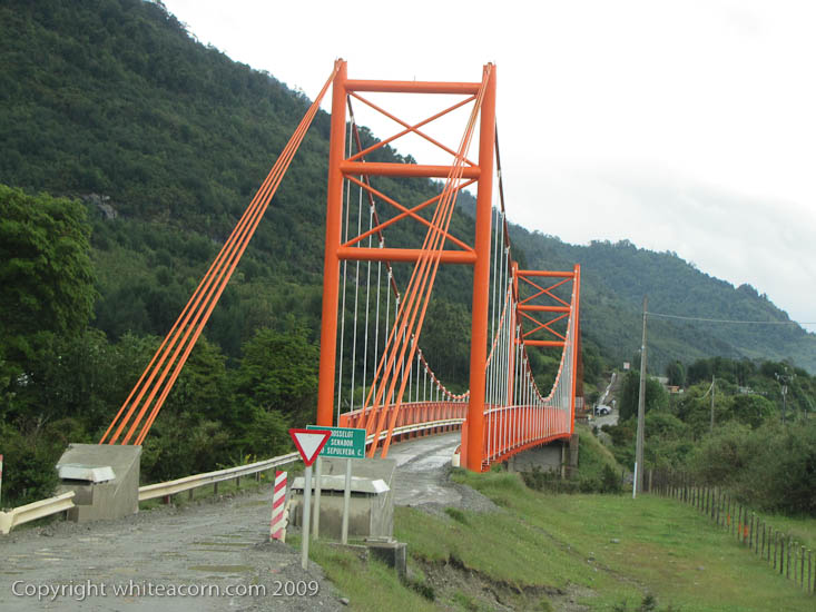 Late in the afternoon we came upon a side road on the east to Ventisquero Colgante which is inside Parque Nacional Queulat. After about 4 km this road brought us to a campground and parking area. After a short walk was a lookout that gave us distant views of a hanging glacier and two very huge waterfalls that were draining the glacier. There was also a suspension bridge over one of the rivers draining the glacier which allowed us to get a closer (not too close) view of the raging white water. The campsites here had rain shelters over the picnic table, we took that as a sign that rain was a regular feature of the camping season.