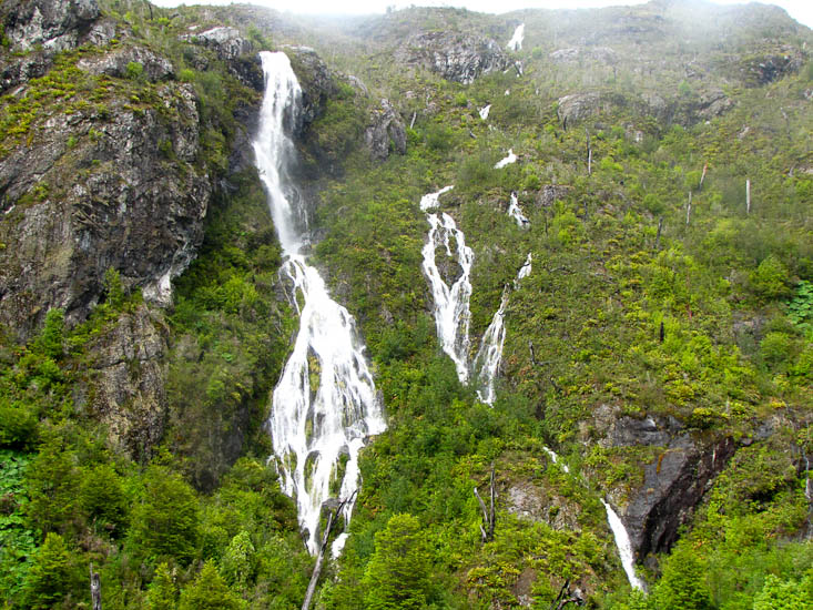 From our gravel pit camping spot we continued south in overcast and wet conditions on a road that was essentially a single track forest road in OK condition. The road was pretty spectacular though, as it travelled along, mostly, the steep west bank of the Rio Bravo and then the equally steep west bank of the Rio Colorado before crossing a narrow causeway to gain the east bank of the Colorado for the final few km into O'Higgins.