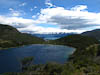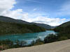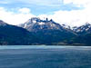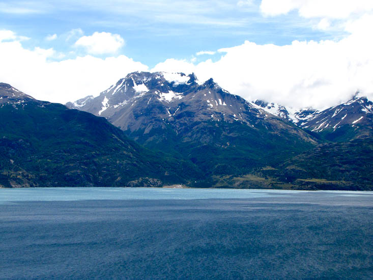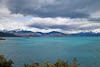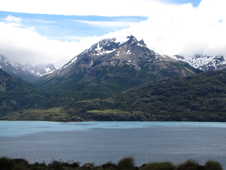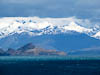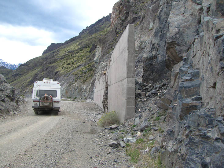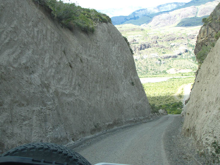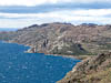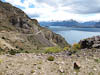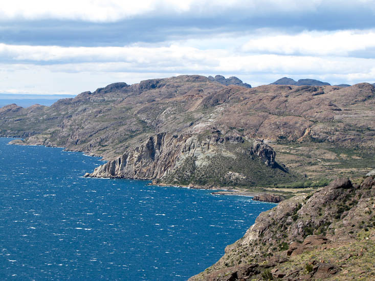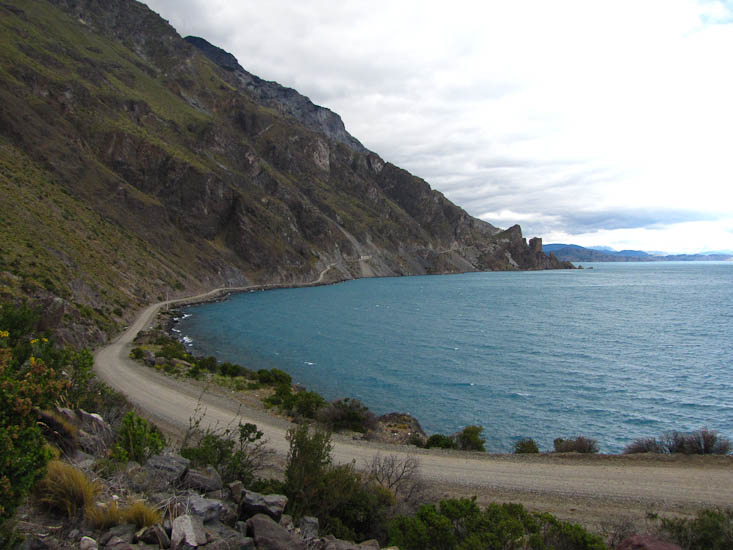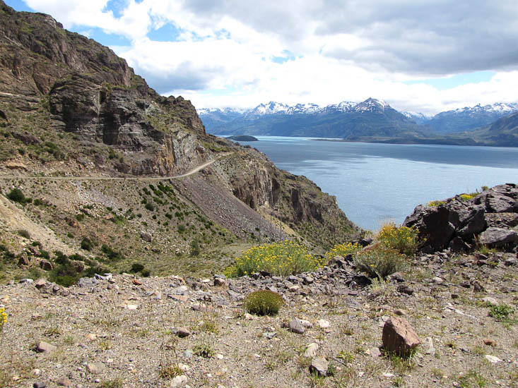 However the size of Lago Carrera was not the big surprise of the day, the road itself and the views it offered were the surprise. Initially the road wandered uphill and down dale like any country road; about a mile or so from the lake. But eventually it joined the lake shore. The shore line is steep rock so the road is, in many places, carved from the rock like a ledge, and is steep and narrow as it winds into bays and up over headlands. The views along the lake shore, north to an impressive range of mountains, and back towards the Austral and its snow capped mountains were simply wonderful and all against a foreground of the turquoise waters of the lake.