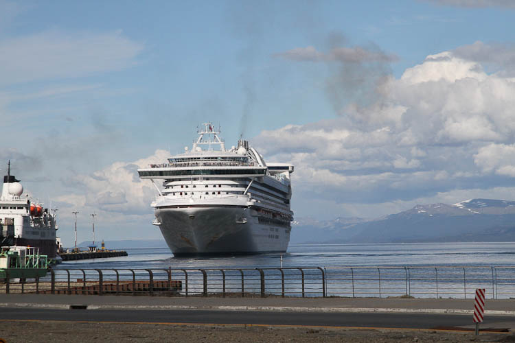 At the end of the road sign we met two German motorcyclists who were just completing the ride from Canada. We also met a few thousand ship tourists taking flash photographs of the mountain scenery.