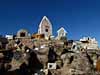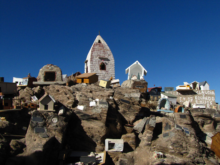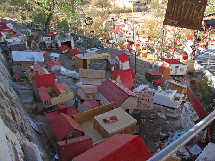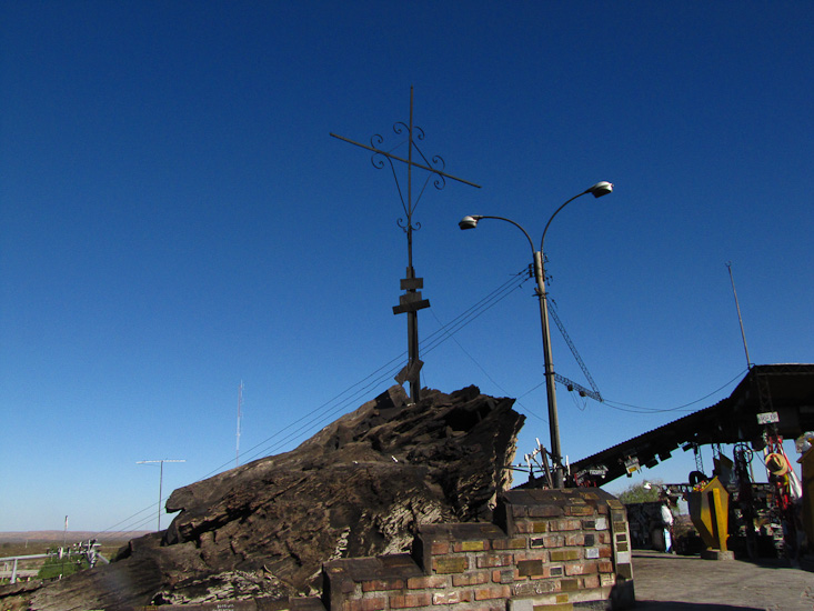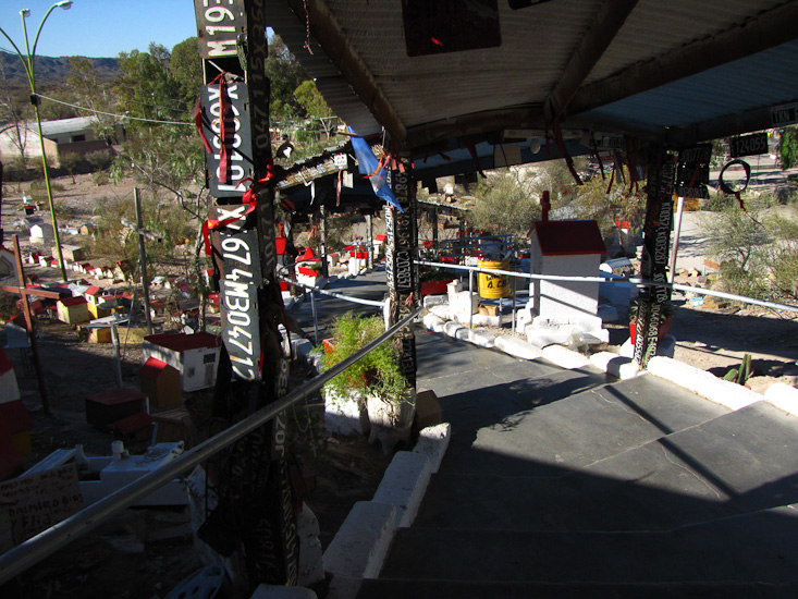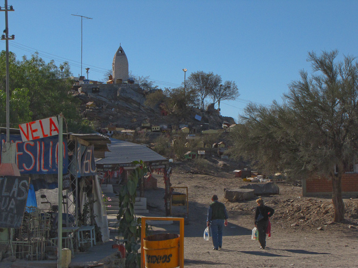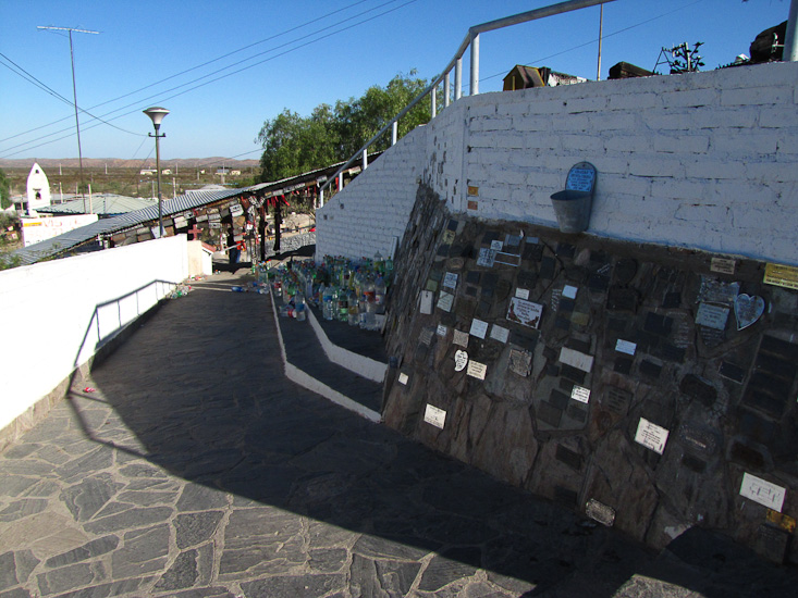 The highlight of the day was the town and shrine of Difunta Correa. You may have noticed from time to time I have include in this journal pictures of road side shrines that are composed of hundreds, sometimes thousands of plastic drink bottles. As I think I have explained before these are shrines to a women who followed her husband to war and dies of privation along the way - the legend is that her body was found with her child still alive suckling at her breast. The shrines are to her. Well today we found the ultimate example of such a shrine, close to the site of her death. It started out as a cross on a hill but today it is a full blown town, with post office, school, gas station and of course lots of souvenir shops. The shrine is composed of numerous crosses, a large fire pit for burning candles, thousands of plaques, thousands of license plates and hundreds of small doll sized houses, plus the inevitable bottles of water. All these left as offerings at the shrine.