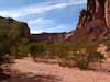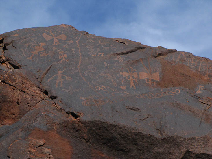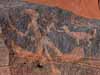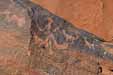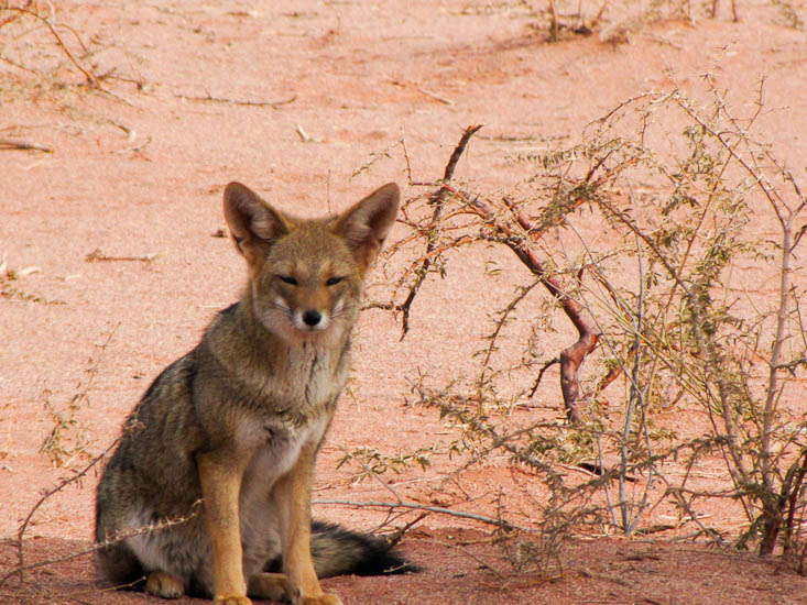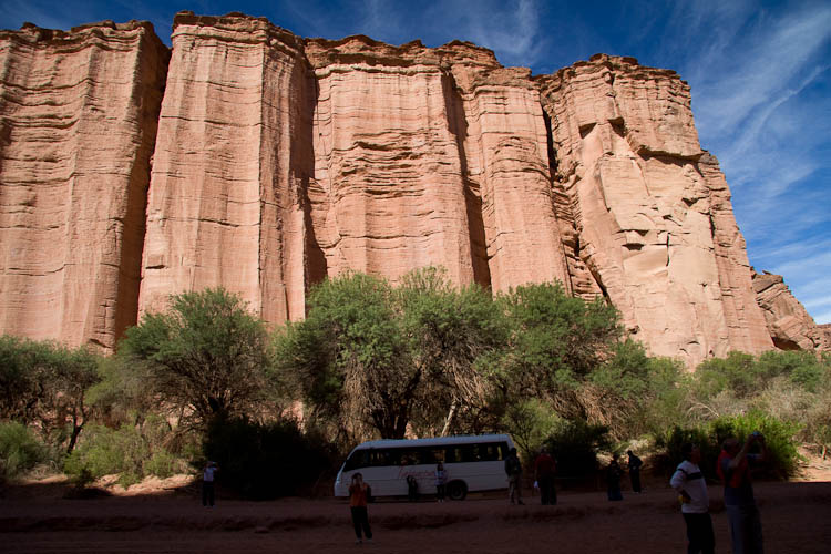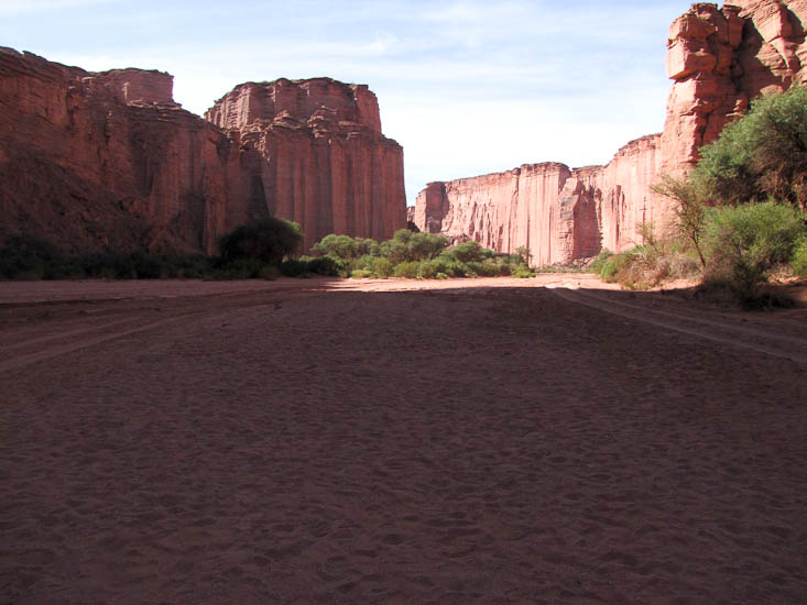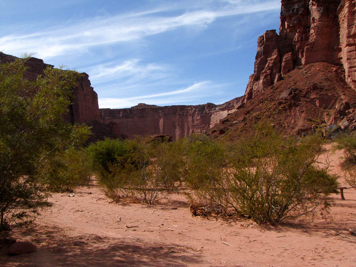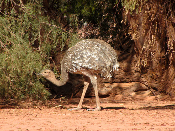 Our next stop was Parque Nacional Talampaya north through more arid country from last nights camp. This park can only be visited as part of a tour, so we joined a group of about 20 in the small bus and headed up the paved road into the park. The road did not last long and then we were in the bed of the Rio Talampaya bouncing along through sand and boulders. We spent the next 3 hours in a gorge with 150 m vertical red sandstone sides, looking at the rock formations, petroglyphs, condors, and nandu's (large flightless birds). It was a spectacular place one of the best gorges we have visited.