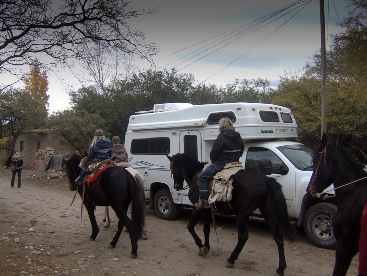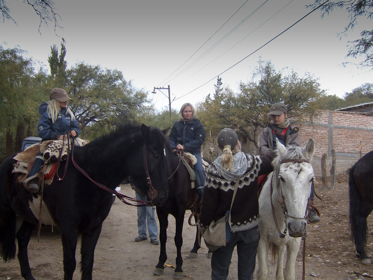 So this morning we went to the hostel to organize for all 5 of us to go riding. We were told "Come back in an hour", which we did - but no one arrived. A phone call, "I'll be their in 15 minutes" - you guessed it 30 minutes later a horse trots up the road carrying the lady organizer. We arrange for 4 hopefully 5 horses at 4:00 pm. At 4:30 as we are about to give up, our organizer arrives with only 3 horses (in addition to the guides horse). That's only enough for the two children and their mother.
