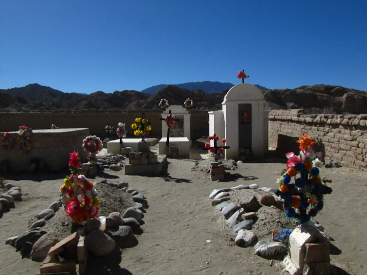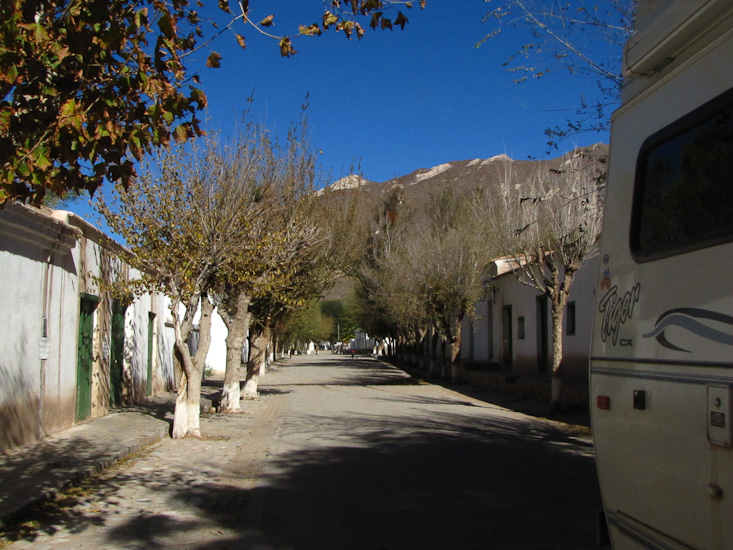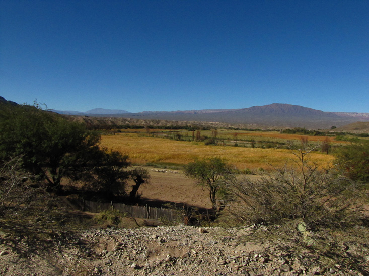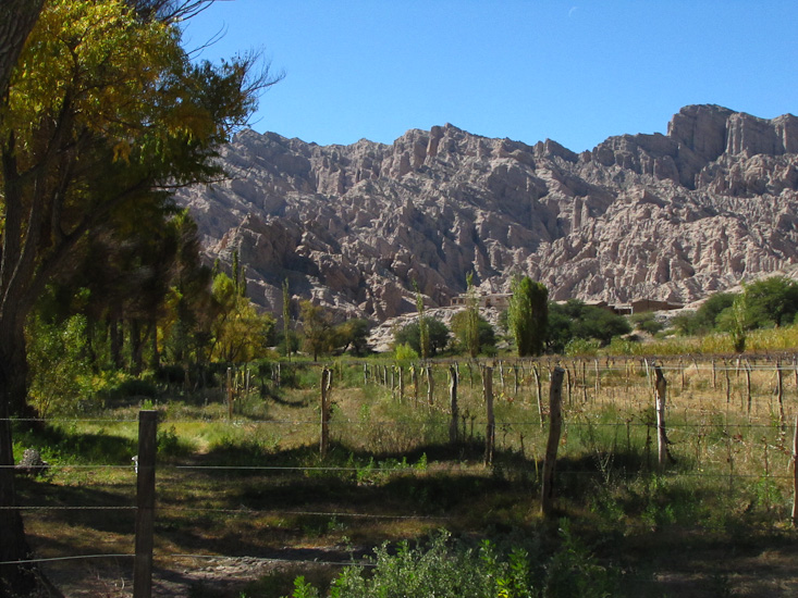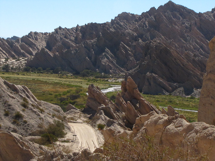 Today we followed Ruta 40 nearly 100 miles north along the valley of the Rio Calchaqui. Though Ruta 40 returned to its tradition of a dusty gravel, and at times rough surface, that sometimes was barely wide enough for a single vehicle, it was a fabulous day. The scenery was magnificent, a green and mostly cultivated wide river flat surrounded by high desert mountains that had been carved into all kinds of shapes by wind and rain.