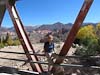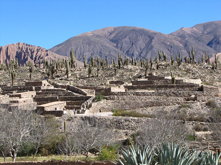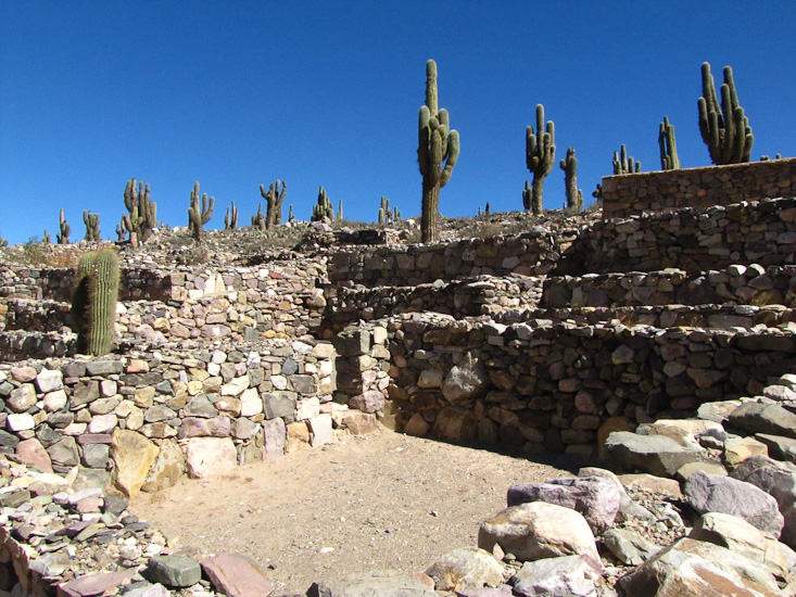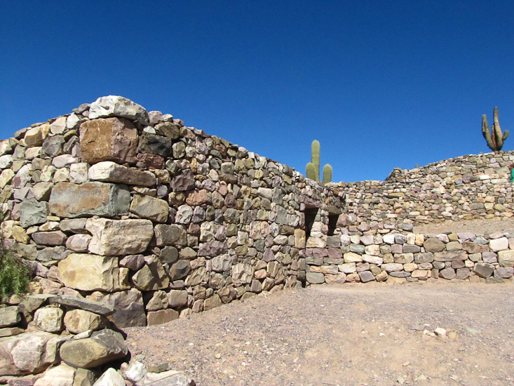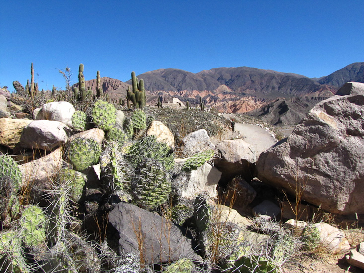 We spent some time walking around an archeological site called Pulcara. Situated on a hill just south of the town center, this site held perhaps 1500 people of the Omaguaca tribe in its hey day in C12-C13. A number of the dwellings have been restored to give visitors some idea of living conditions. The site is covered in large cacti called Cardon. Traditionally these plants provided the only building timber in much of Northern Argentina as no true trees grow naturally in the region. The wood from the Cardon has a distinctive pattern of holes in the surface where the thorns of the living plant were. At the base of the hill Nina toured a cactus garden and was fascinated by cactus plants that appeared to have wool/fluff growing among the thorns.