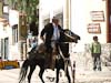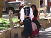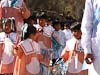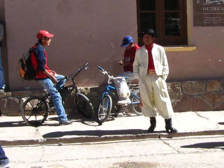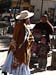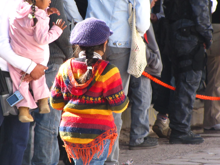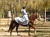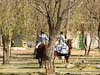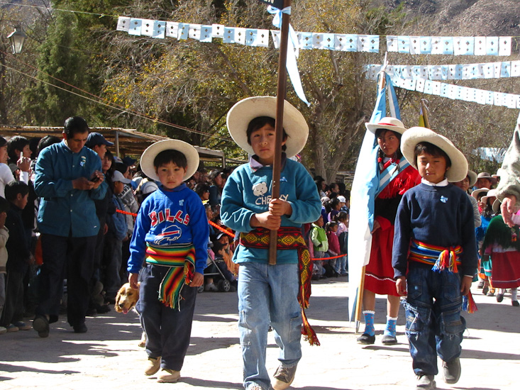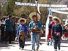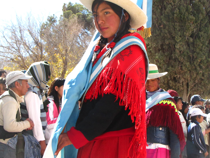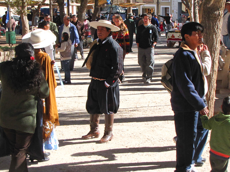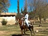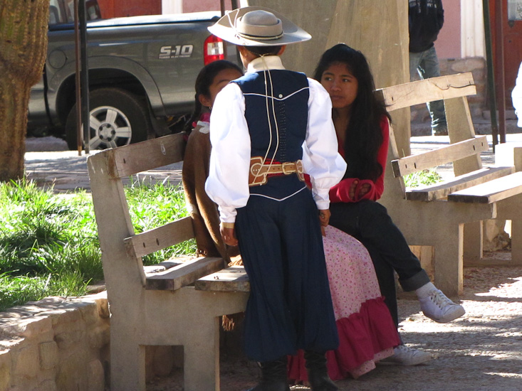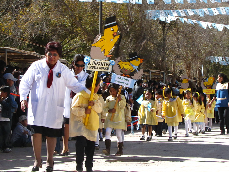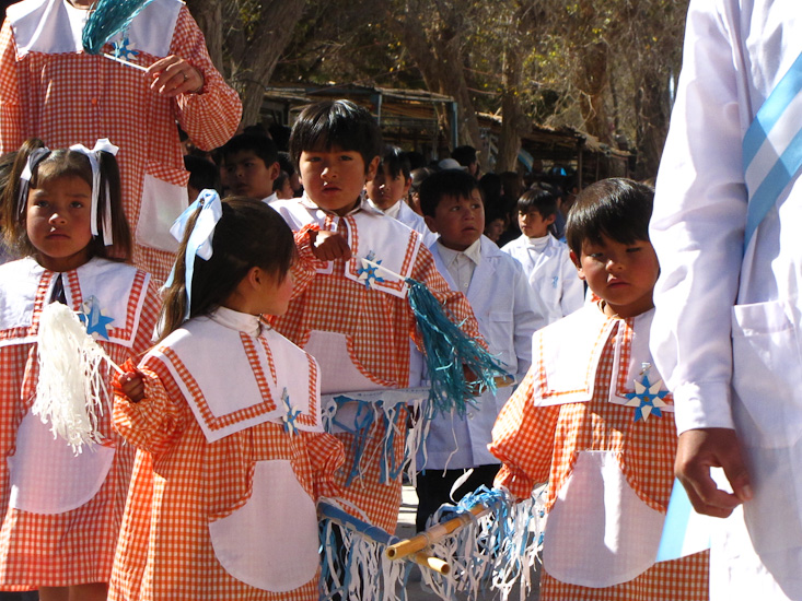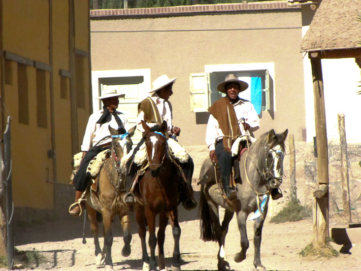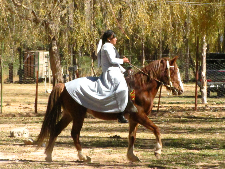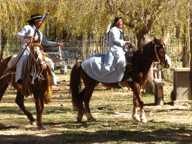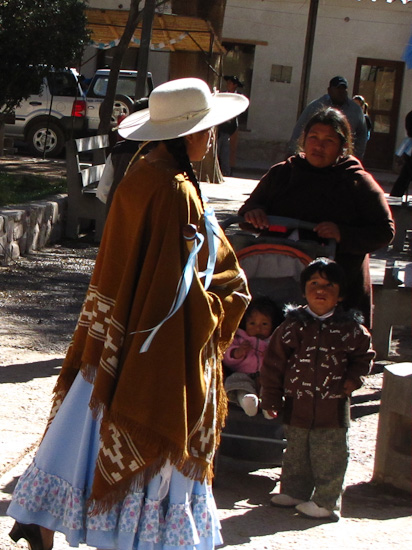 About 10:30 we walked the short distance to the main square and waited around listening to the interminable speeches with the rest of the crowd and sampling some of the empanadas on sale everywhere. The parade eventually got underway and for a number of hours we were treated to numerous local school groups "marching" past the square. It was more than a little surprising to see how many schools and children there were in this region. The parents of the marching children were like parents everywhere - with their cameras out they raced along beside their darlings trying to get a few thousand snaps to remember the day. We found the crowd at least as interesting as the marchers. Kids stuffing themselves with ice cream, parents trying to keep bored younger children amused, men dressed in gaucho walking around (with knives in their belts) greeting each other with kisses and chatting, and everywhere food vendors. In a way the scene was both exotic, but strangely familiar - for all the differences not unlike a parade in any country town. Eventually the sun got to be too much for us and we headed back to the campground for some relief. It was only once back at the campground we got to see the gauchos in any numbers. Many of them were meeting at the campground after the parade for a barbecue. So we got to see many men in balloon pants, and ladies in bright blue dresses riding on their ponies. They gave displays of their riding prowess whilst riding their animals around the campground.