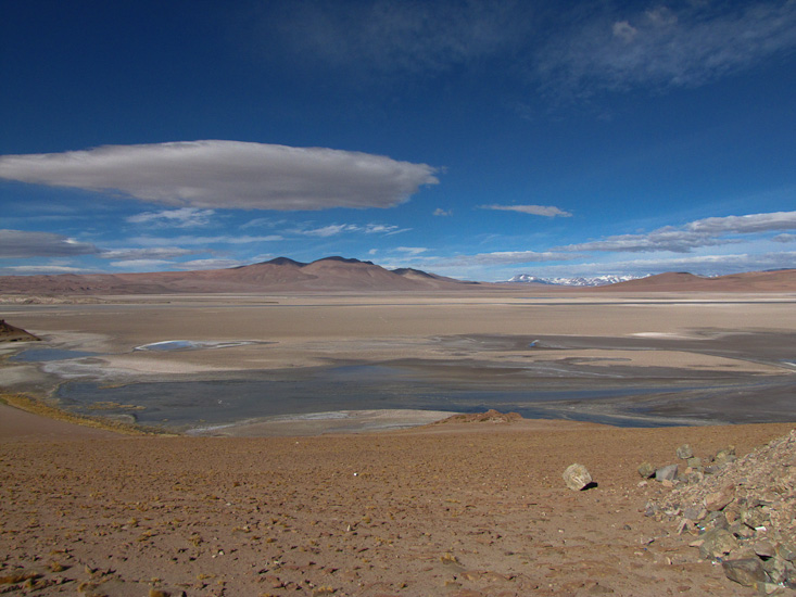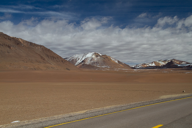 Our journey today continued across the Andean highlands to San Pedro de Atacama. It's hard to capture the beauty, barrenness and spectacle of the scenery. We travelled at between 4000 and almost 5000 metres (13,000-16,000ft) most of the day, surrounded by higher barren multicolored mountains, the occasional salt pan and little habitation.