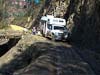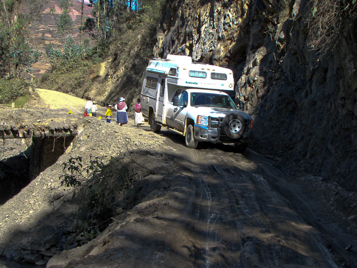 Leaving Sorata proved to be a bit of a challenge. Not only did we have to negotiate the steep narrow roads back to the town center, including once again passing through the (now more) muddy ford, but approaching the main square along the only paved (with stones) street in the town we got stuck in a deep depression in the street and required 4x4 to get out. However with that little trouble out of the way we settled back to enjoy the stupendous views as we climbed back to the valley rim with Mt Illampu towering over us at every turn.