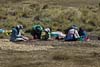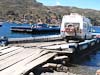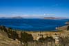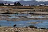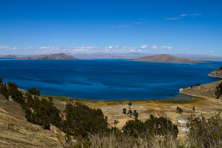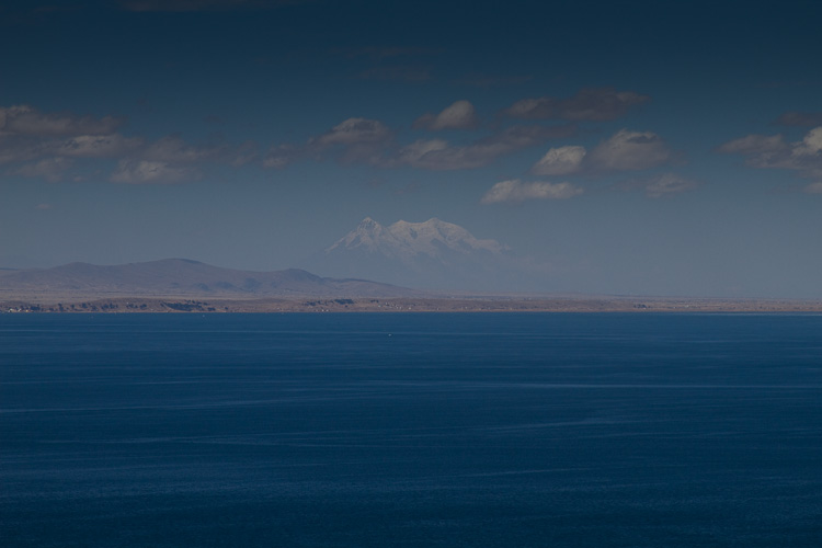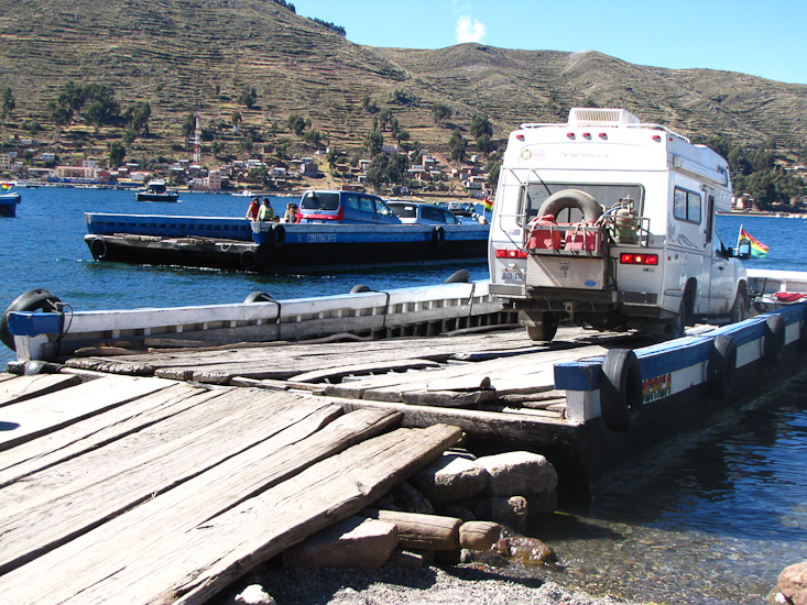 We retraced our steps of a few days earlier and eventually found ourselves traveling beside Titicaca towards the town of Tiquina. At this point the lake narrows to perhaps a mile across and vehicle traffic is transported across this narrow straight on a series of barges. These are old wooden craft that will each carry 2-3 vehicles and are powered by 40 hp outboard motors, our ride cost us 45 bolivianos - about $6. Once off the barge the road climbed up onto the upper slopes of the tall rolling hills that surround Lake Titicaca. For many miles we traveled perhaps 1500 ft above the lake surface with great views of the lake as it disappeared into the haze to the north and great views of the Cordillara Real and Illampu to the east.