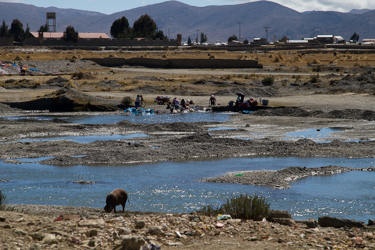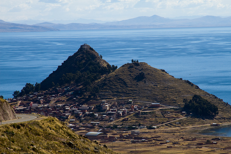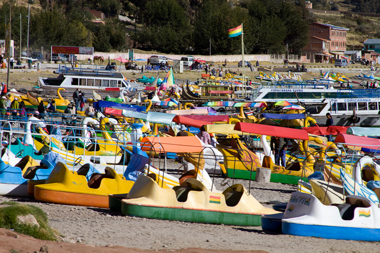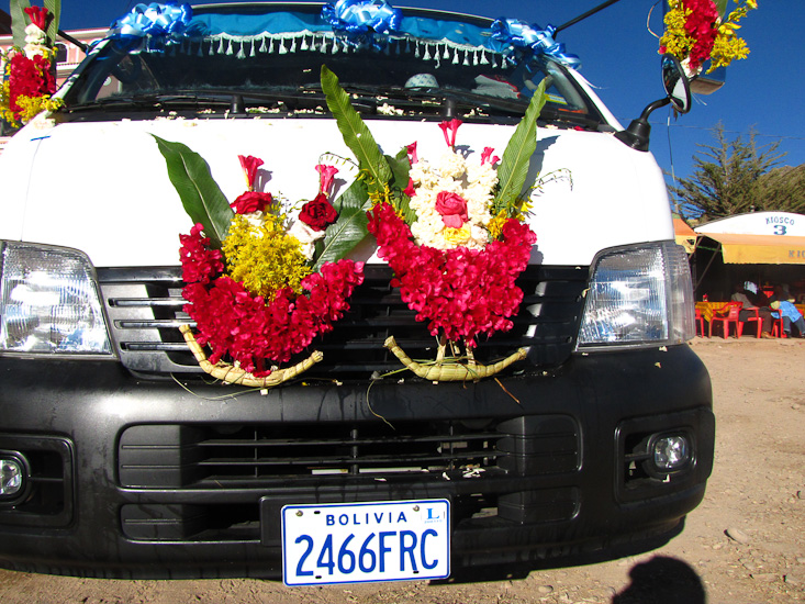 Eventually after topping out at 4200m the road dropped down into Copacabana. After paying 25 bolivianos (5 bs to the police to check my drivers license and 20 bs as a toll to the town) to get into the town we squeezed our way through the throng of holiday makers and their vehicles to the lake front and Bolivia's only beach. It took us only a short while to find a hotel with a parking lot and then we went off to explore the town and be embarrassed by the weird getup of many of the western tourists