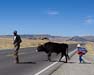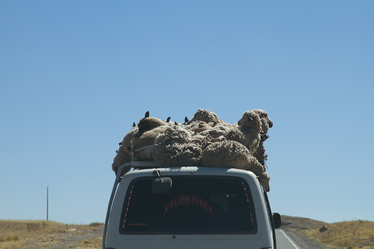 The answer is astoundingly simple but I would not have thought of it. You tie 4 feet of each animal together so they cannot move and then stack all of them in the vehicle roof rack. Of course the people go inside. We did not get a photo of llamas in this position but you can see the photo of the sheep being so transported.
