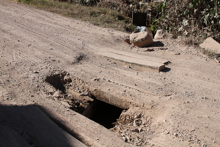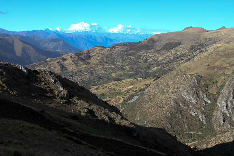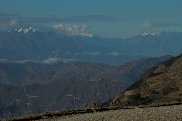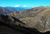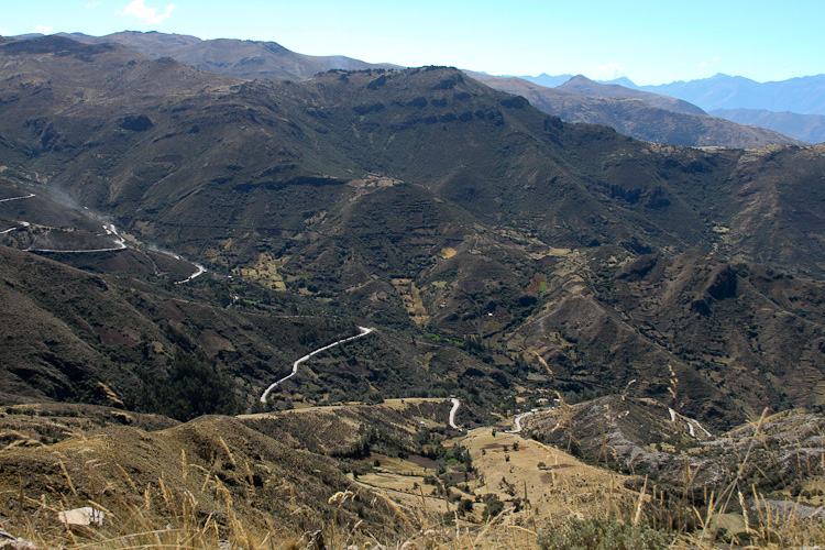 From the river a long and dusty climb regained altitude, past the village of Ocros, and then another steep twisting climb on perhaps the most nerve racking road of the trip; A steep one lane road, with many switchbacks, and many oncoming vehicles including 40' buses certainly had the adrenaline flowing in both of us. The concentration required to negotiate this road did not prevent us from getting some enjoyment from the truly spectacular scenery.