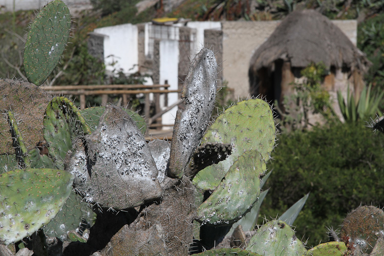 There were cacti covered with a white power and white blisters that we were told was the cochineal bug. This is harvested to produce the cochineal that one has in the kitchen cupboard, and is used to produce many different colors besides red by adding different solvents.