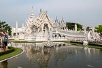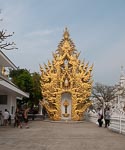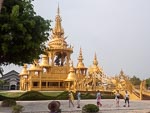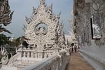 So lets be tourists. First on our agenda was Wat Rong Khun other wise known as the White Temple. It is a private art exhibition in the form of a Buddhist Temple by artist Chalermchai Kositpipat. There are (I think) three main buildings. The White Temple which is made of concrete and glass with large murals on the inside depicting the cycle of life. Interestingly the rear wall of the White Building is a mural depicting World War 3 and including such characters as Bin Larden, George Bush, Spiderman, Kearno Reeves and Micheal Jackson. It is not clear to me who the heros and villains are.