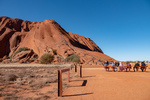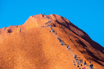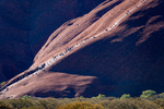 It was cold overnight, we estimated (don't have a thermometer) in the mid 30°F. So consequently we did not hang around at our bush camp but got underway towards Uluru where our observations about the tourist season was further confirmed. Just take a look at the line of people climbing Uluru and what you can't see are the 1000+ vehicles parked just near.