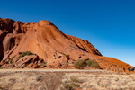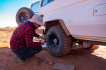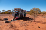 The Great Central Road starts only 2 km from the Olgas and that's where we headed next. However before "really getting started" we decided to have lunch so I pulled off the road into what I thought was a nice bare patch of red sand. But I should have looked more carefully because it was not bare enough and I managed to find a small plant that managed to drive a small branch through the side wall of a rear tire. That's why the photos show me pretending to be a mechanic.