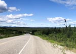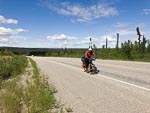 The road from Watson Lake to Whitehorse is not exactly crowded either with other travelers or settlements, it is just miles and miles of light grey road surface amongst the never ending forest. I tried to capture the sense of this never ending-ness with the first image in the second group of images. You can just see the continuation of the road at the middle right of the photo. While I was taking this photo I saw a bicycle rider coming towards me so decided to wait and try to capture the same image with the rider in the frame. Riding this road at 60 mph on a motorcycle is a bit tedious at times I cannot imagine what it is like at 10 mph. Anyway the rider stopped and we had a chat, he started from Anchorage, via Fairbanks and his goal is to ride to Key West Florida. Of course he was German.