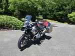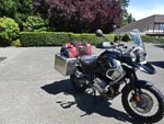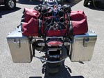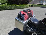 The all up weight is approximately 95 lbs split equally between the two panniers and a 75 liter dry bag. This will increase by 15 lbs when I have to carry extra fuel (2 gallons in a plastic container that I will buy along the route). The dry bag is far from full so will offer space if I need to acquire more stuff. The following photos show how these items of luggage sit on the bike.