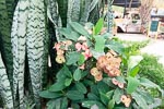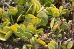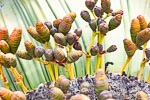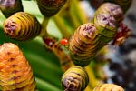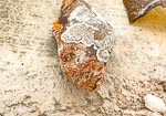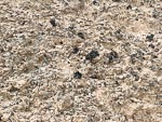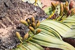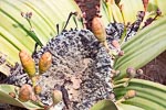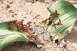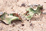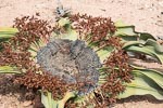 After a look around town we headed up the good quality highway towards Swakopmund before turning inland to an area called The Moon Landscape. As it turned out this is an area that is basically in and near the bed of the Swakopmund River that has been cleared of sand by the irregular water flow of the river to expose a large area of carved volcanic rocks. It is also an area which has some very unusual plants. The green plant pictured below and tagged Source of bitter liquid is called a Dollar Plant as its leaves are approximately round like a silver dollar. The rocks in this area often have Lichen growing on them and the colours vary from dark almost black to red. For those who are desperate lichen can be a source of food and the dollar plant can be squeezed for liquid to drink. The most unusual of the local plants is the Welwitschia Plant (click here). This is a very slow growing and long lived plant, named after the Austrian Botanist who documented the plant in the 1850s. The plant only has two leaves one each side and those leaves get split to look like multiple leaves by the sun and wind. The age of the plant can be estimated measuring the width of the plant's center using the distance across the knuckles of a human hand as the units, 100 years for each hand. The plants are dioecious, meaning some plants are male and some female.
