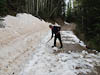 Our plan for the day was an ascent into the La Sal Mountains on the east of Moab. These are in contrast to the red rock of Moab, The Arches and Canyonland. The La Sals which range up to over 12,000 ft are green and covered in pine and aspen. Our route took us south east of Moab and up a steep forest road with some impressive switchbacks. At about 9,000 ft we passed a car containing two WA tourists who were turning back as the road was too rocky for their hire car. We (unfortunately) continued. It was not long before we were passing small mounds of snow laying across the uphill edge of the road. This is a sign that you would think we would now know and take heed but no, we continued. After passing one particularly narrow section where we were squeezed between the snow on the uphill side and a steep drop and soft edge on the downhill side we came to a bank of snow completely covering the road. Progress was stopped. So we turned out attention to retracing our path. That is reversing as there was no possible chance of turning around. Our first attempt to reverse over the previously mentioned narrow section only succeeded in starting to collapse the downhill side of the trail. A new approach was called for - digging.