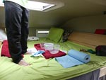 The rain, and the particular pitch(slope) of our camping spot revealed yet another problem. The over-bed opening skylight started leaking. Over the course of our stay I applied a number of tapes and sealants to stop the leak but only succeeded in reducing the flow not eliminating it.